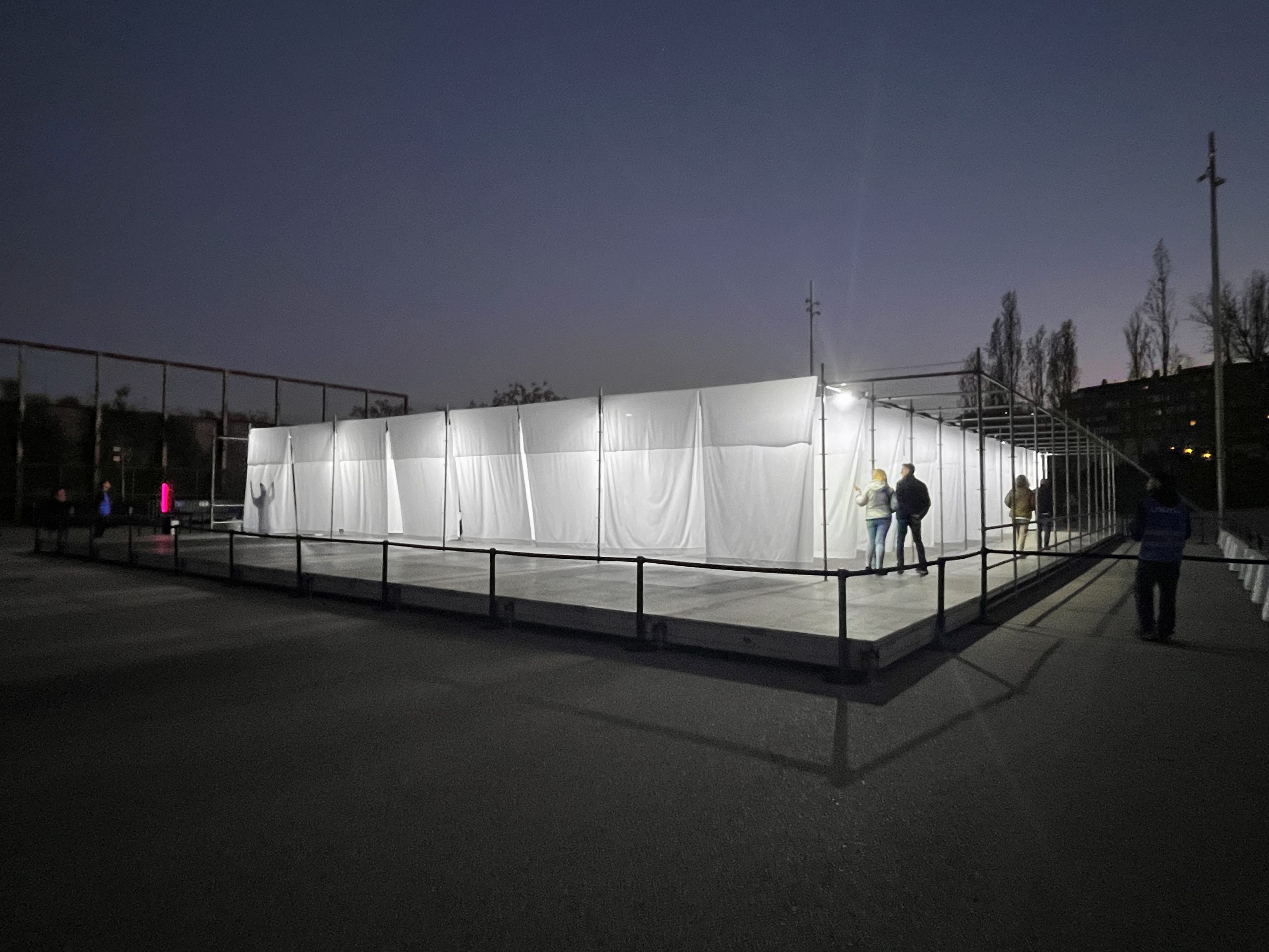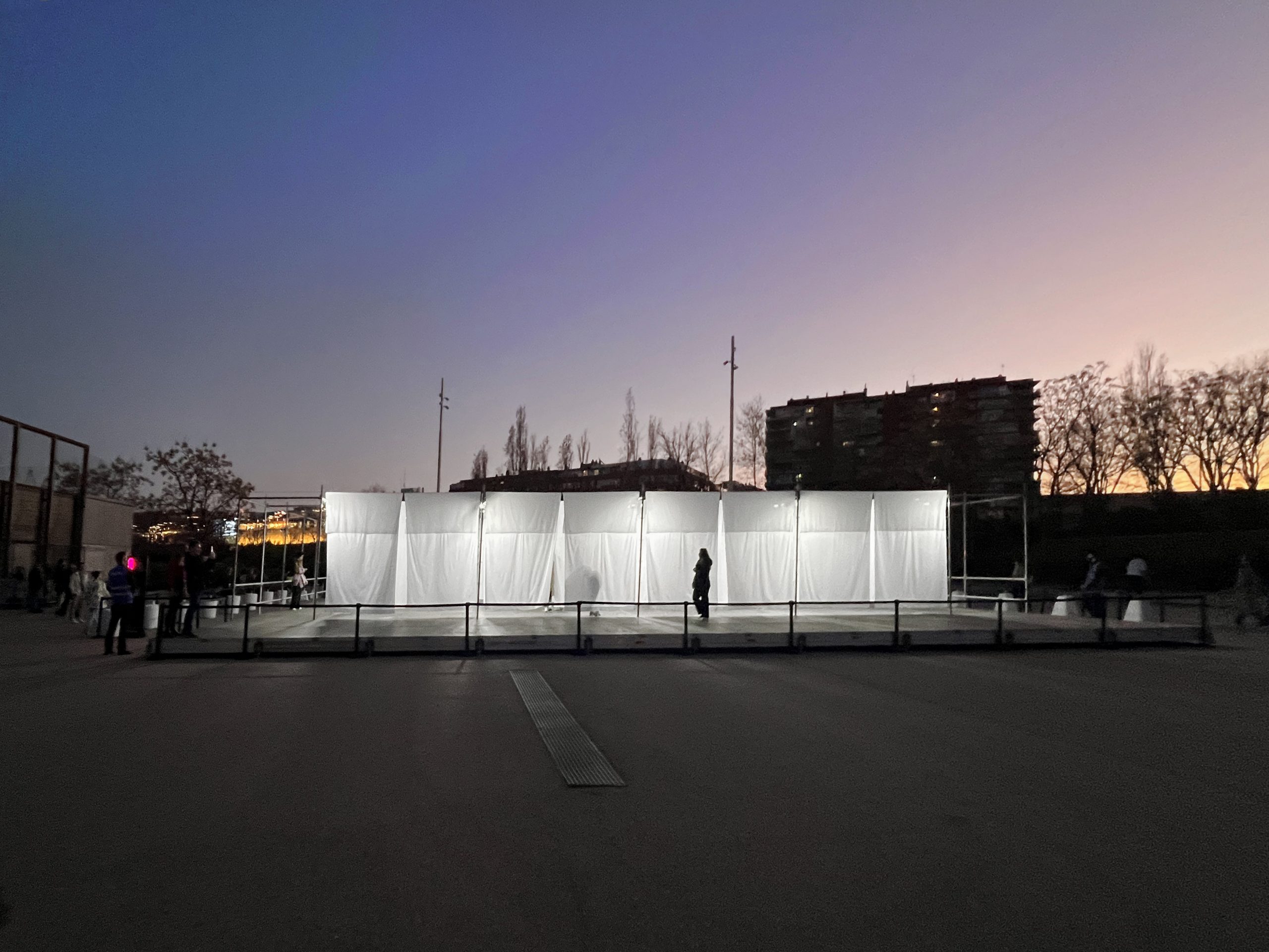 The installation consisted of a large clothesline holding nearly one hundred backlit white sheets, creating a light and ever-changing landscape that constantly transformed with the wind. The structure was built using a simple Layher scaffolding system, whose industrial appearance contrasted with the lightness of the sheets moving in the air.