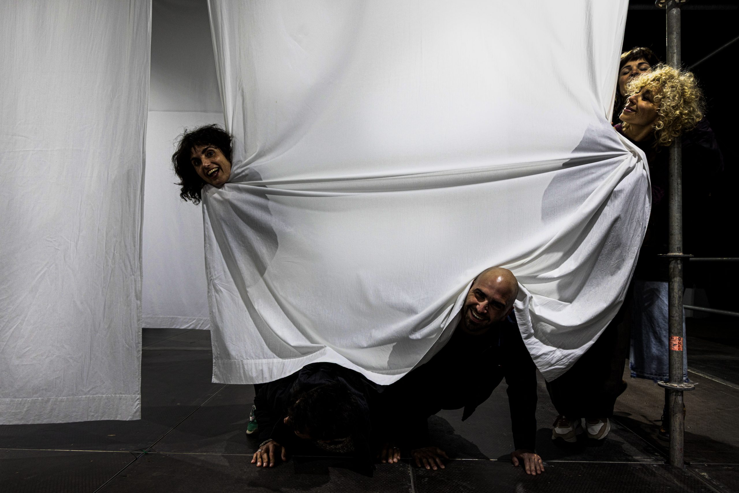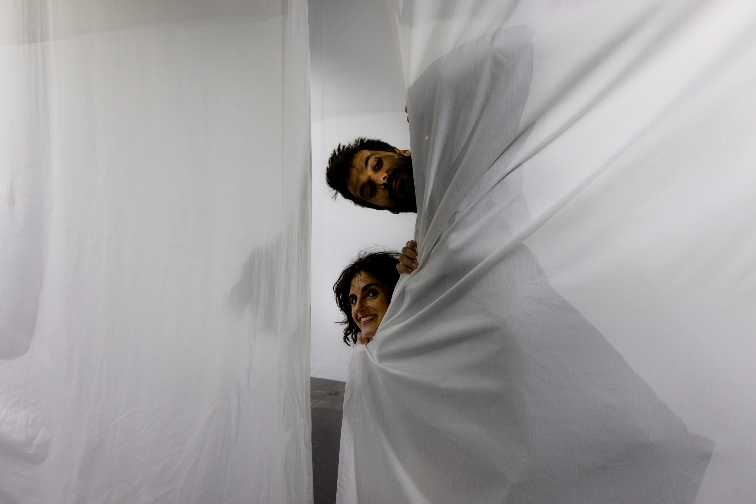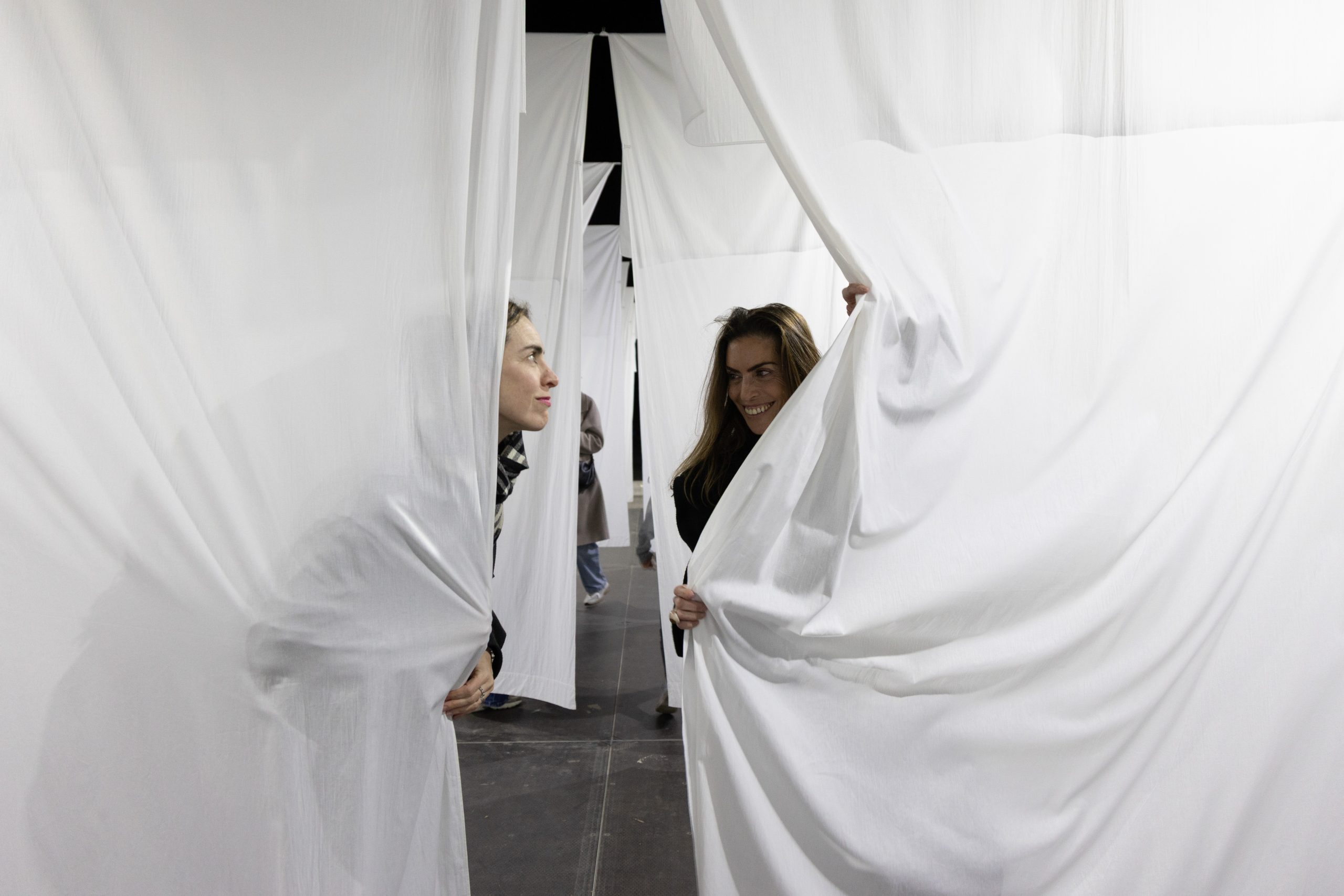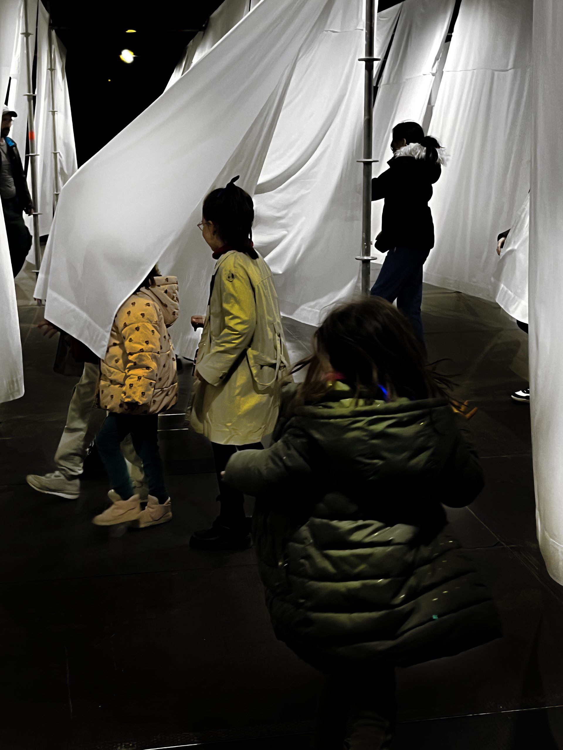 Durante los días de la instalación ocurrió algo que nos pareció especialmente bonito: los niños entendieron la pieza de inmediato. La convirtieron en su campo de juego, corriendo entre las sábanas como si se tratara de un pequeño laberinto. En muchos casos incluso arrastraron a sus padres a participar, invitándoles a comportarse durante un rato como niños grandes.
