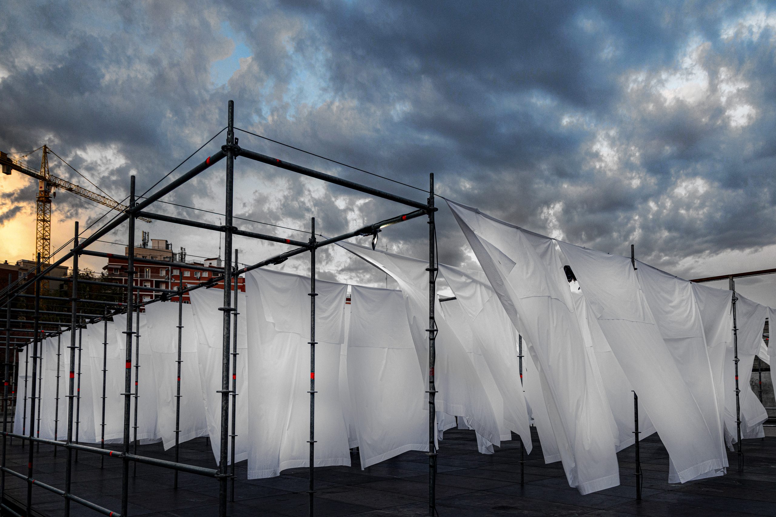La instalación estaba formada por un gran tendedero con cerca de un centenar de sábanas blancas retroiluminadas, creando un paisaje ligero y cambiante que se transformaba constantemente con el viento. El montaje se resolvió con una estructura sencilla de andamio Layher, cuyo aspecto industrial contrastaba con la ligereza de las sábanas agitadas por el viento.