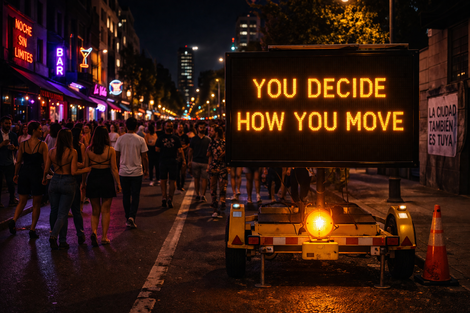 In order to make our installation worthy of such a lofty setting, visible from all access points to the square, and stand out amid the crowding advertisement, the variety of buildings, the chaotic transit, and the light pollution, we had to raise it over 25 meters (82 ft) above the ground – quite a building challenge. We achieved this by a complex system of scaffolds and cross sections made with iron extracted from old billboards. We attached our plastics to these panels and fixed them to the structure until the obelisk’s perimeter was covered and the fence around the monument disappeared out of sight.