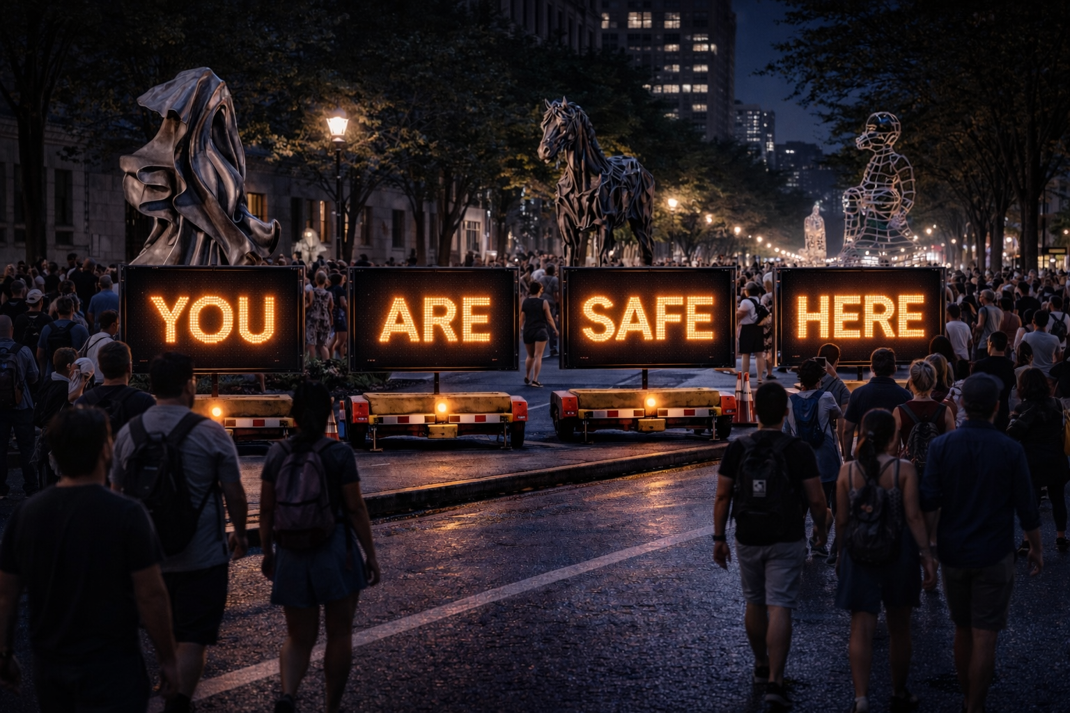 Our deepest appreciation to the lighting technicians who never gave up until the light seeped through the plastic. To the people who set up the scaffolds who, secured by harnesses, attached the panels while working at a considerable height as though they were walking on the ground. To the security guards who watched the piece and also assisted the visitors in the best of moods. And, of course, to the visitors who shared this experience on their social networks and generated thousands of visits and reflections.