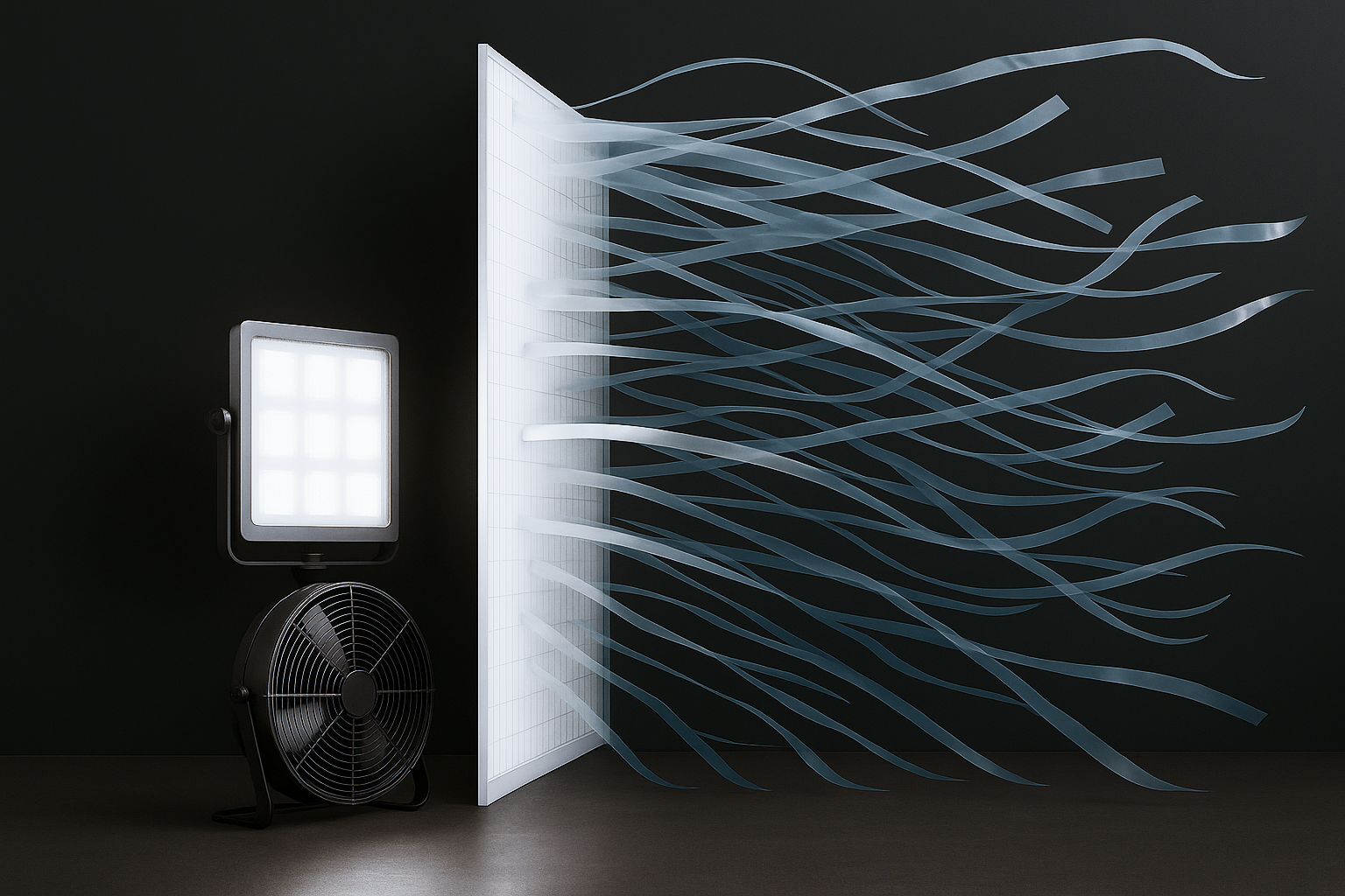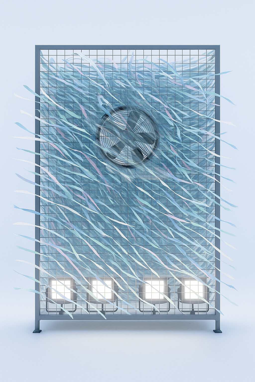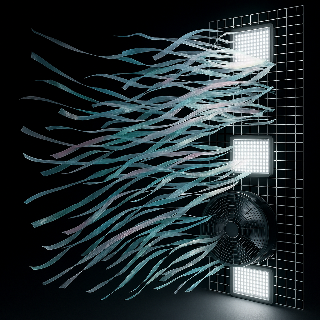 Dentro de las estructuras que forman el pasillo de luz estarán alojados los focos de luz fría y ventiladores encargados de mover el plástico. Las paredes de la estructura serán de lona blanca microperforada, lo que permitirá que salga la luz y el aire del interior.