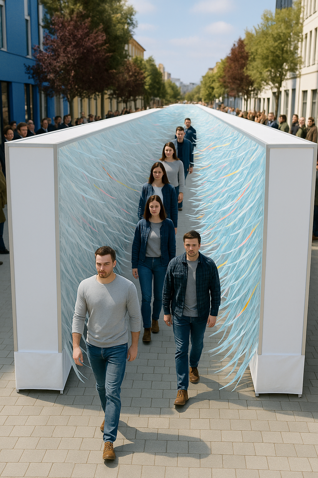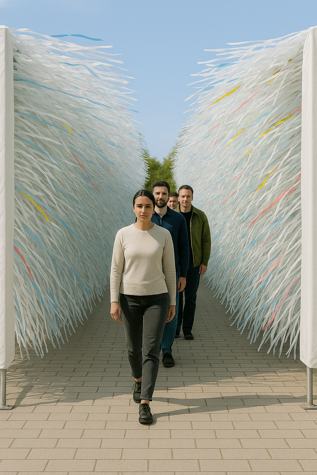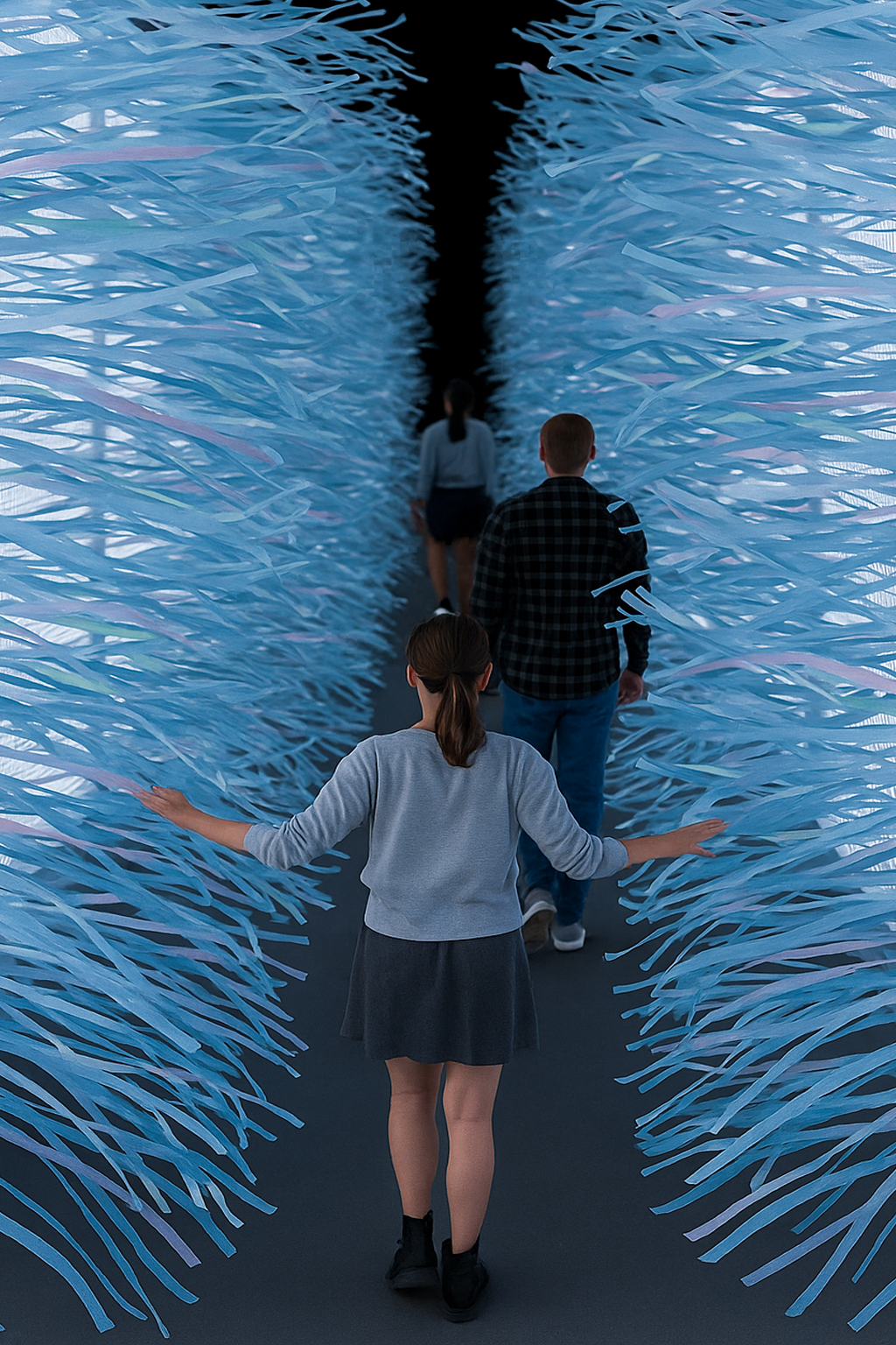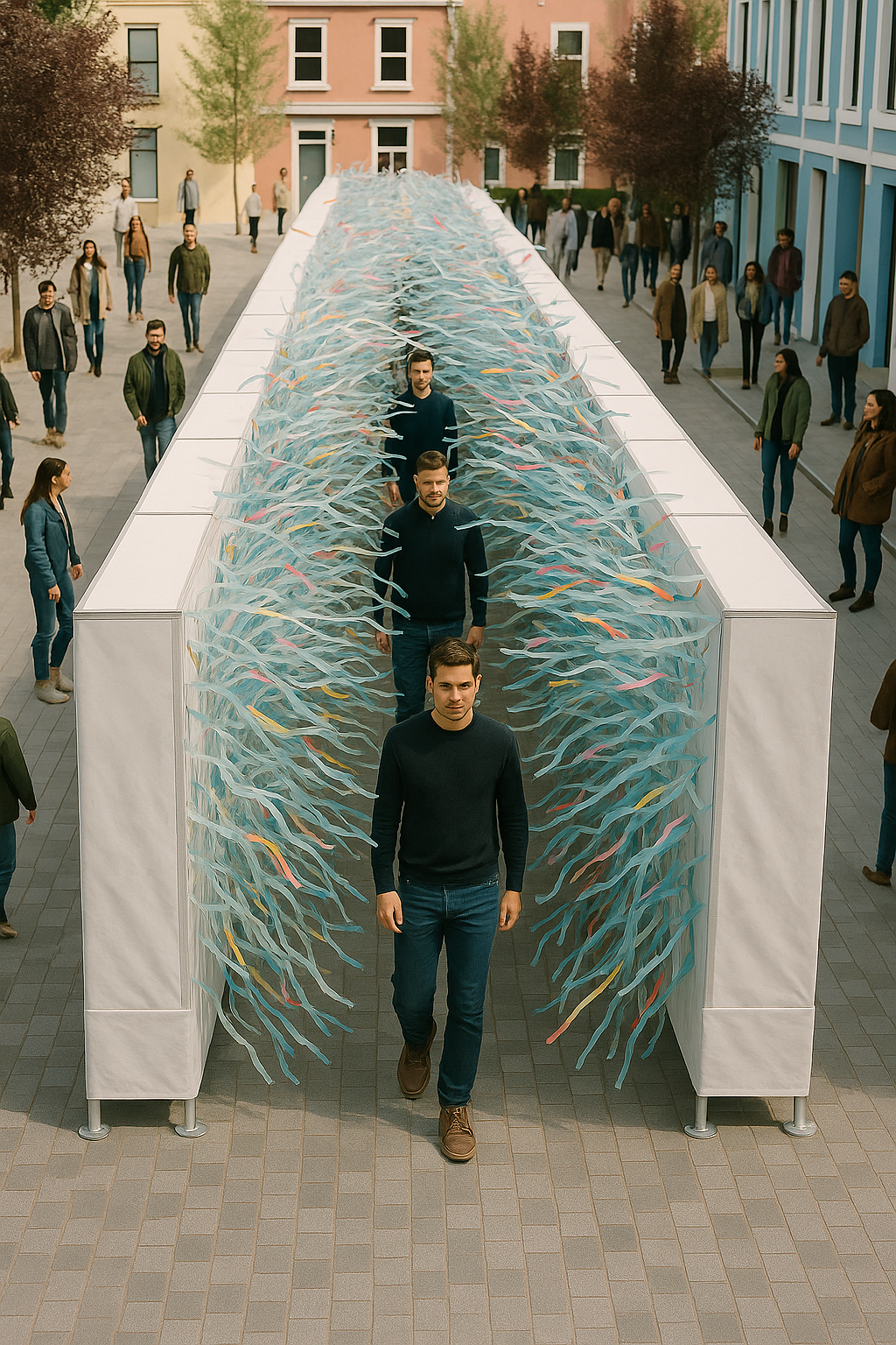 Para ello crearemos un gran túnel de viento, luz y aire por el que se invitará a los visitantes a internarse de manera que se sientan incómodamente acariciados por miles de tiras de plástico reciclado, acercándose hasta casi tocarnos.