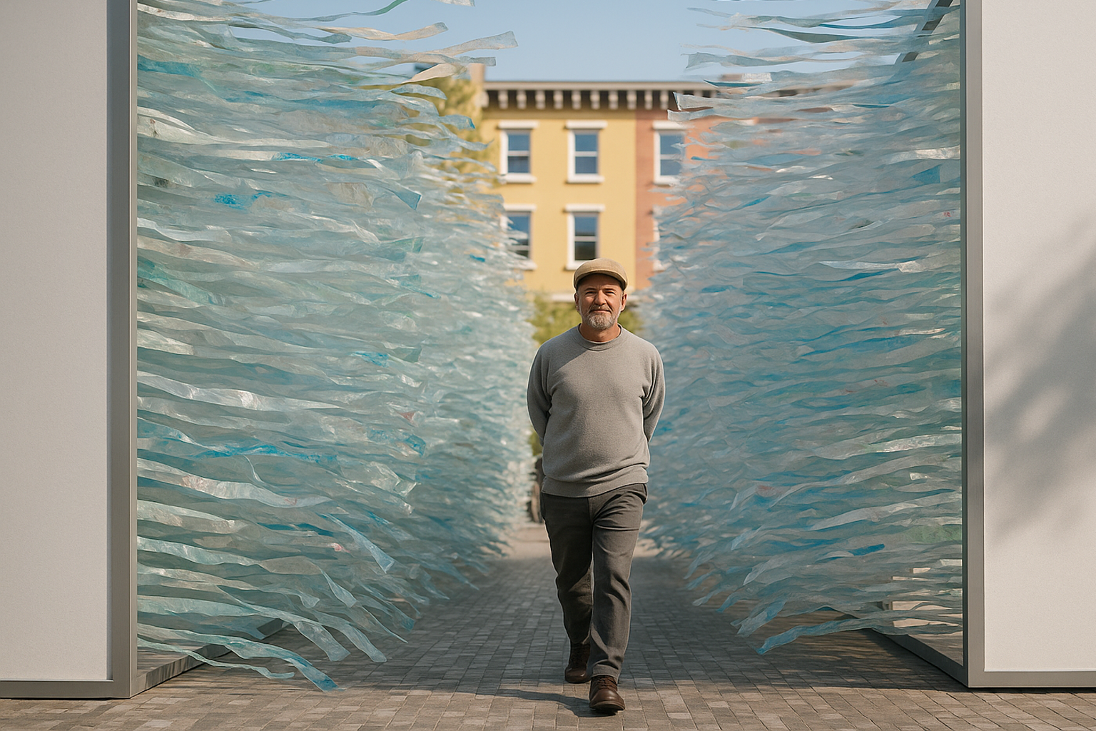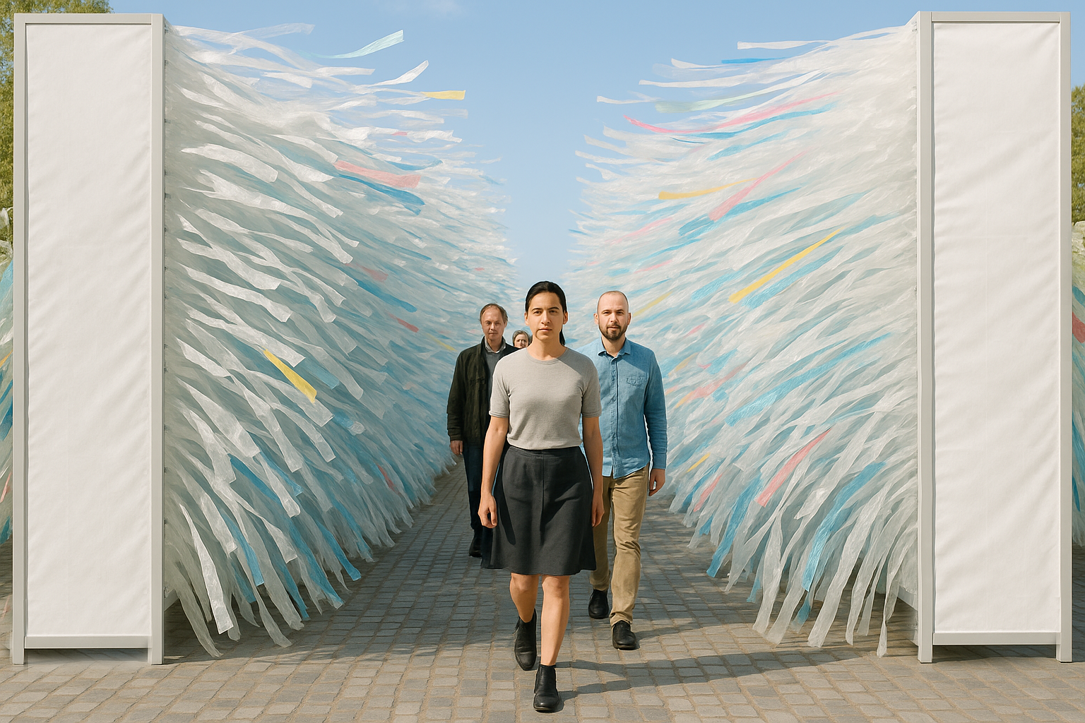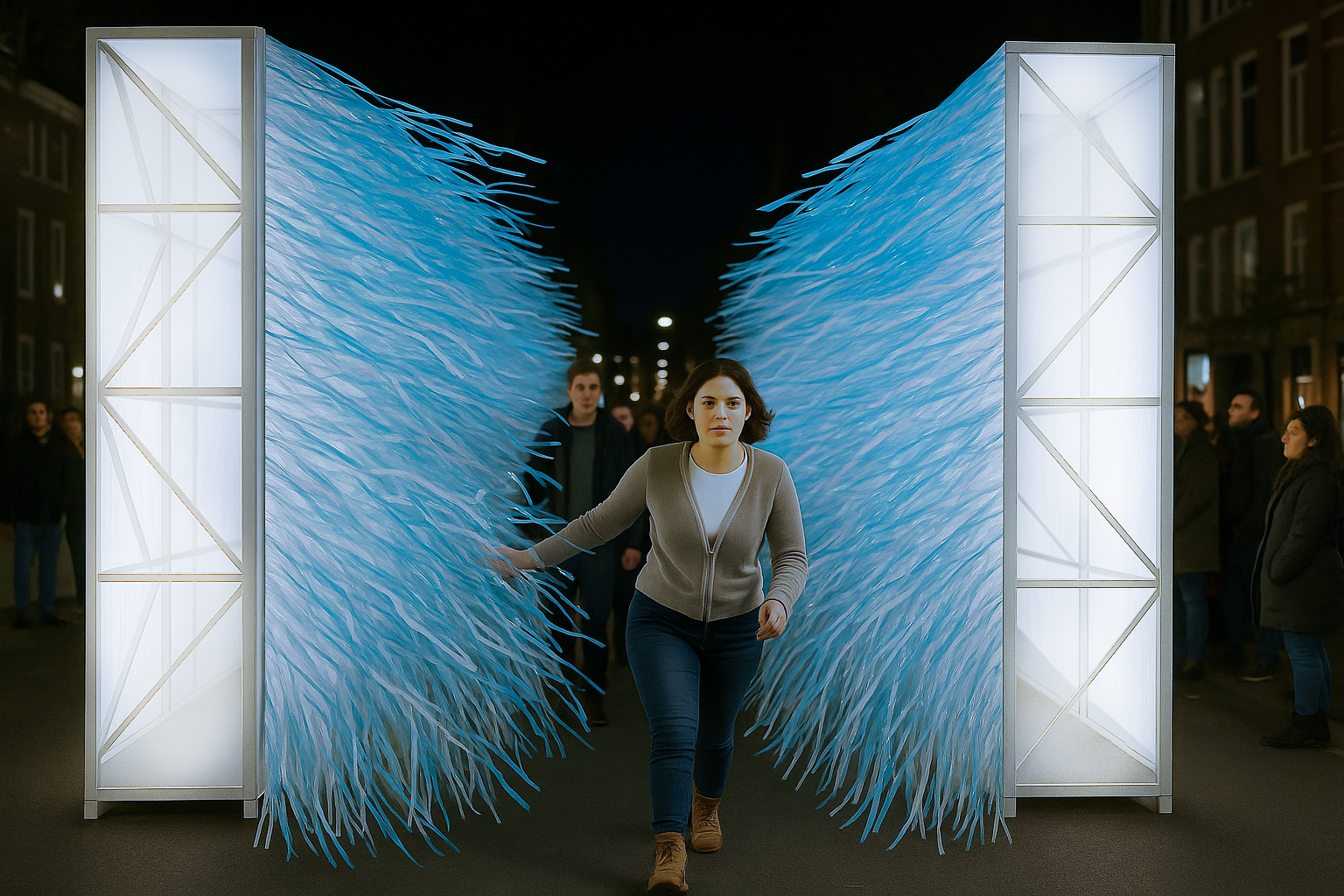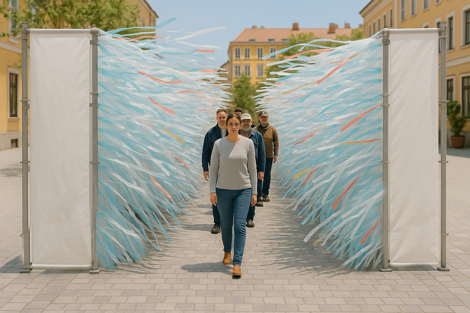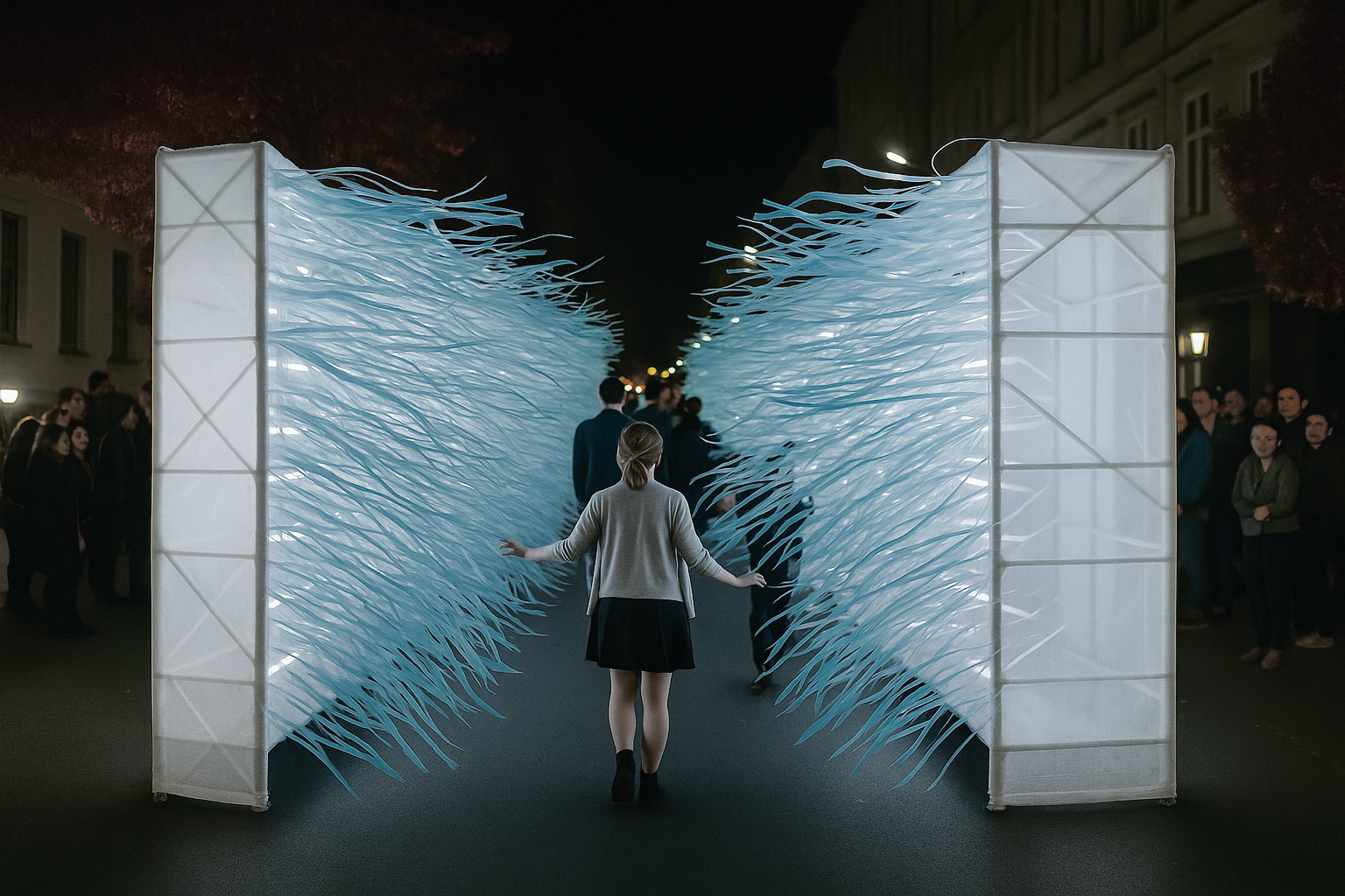 Para ello crearemos un gran túnel de viento, luz y aire por el que se invitará a los visitantes a internarse de manera que se sientan incómodamente acariciados por miles de tiras de plástico reciclado, acercándose hasta casi tocarnos.