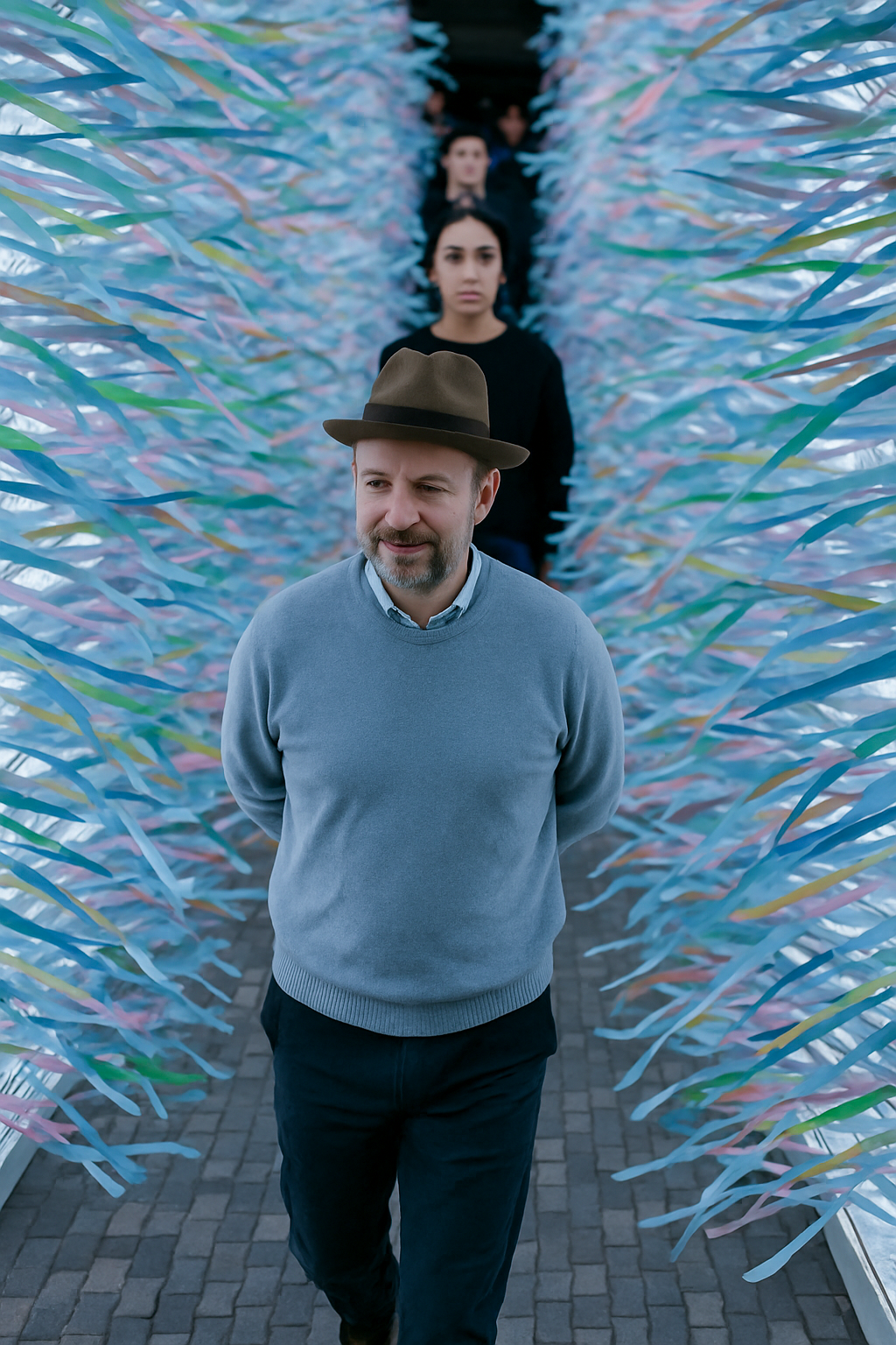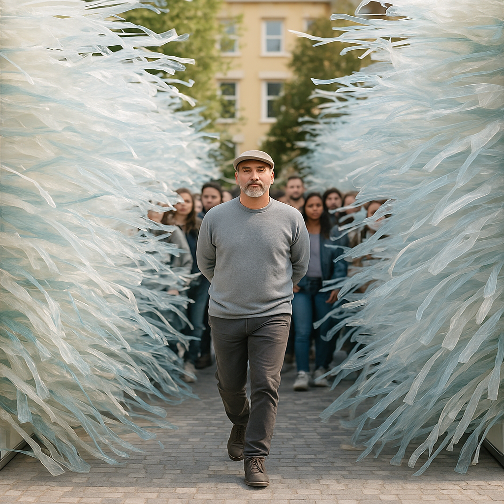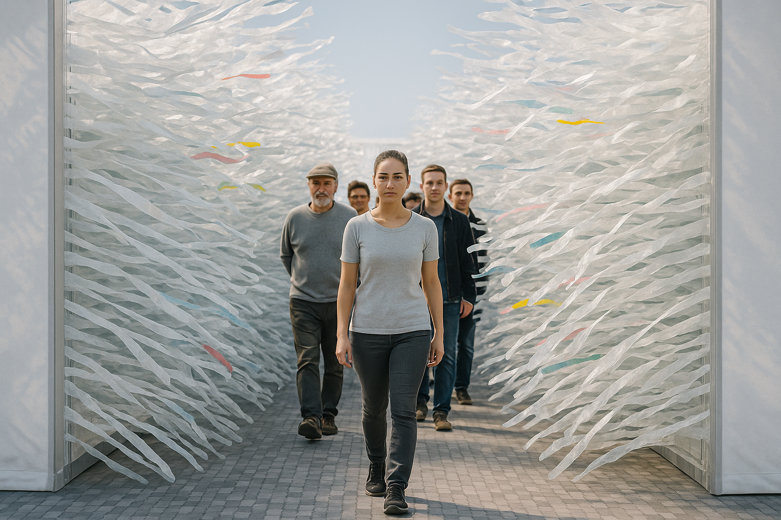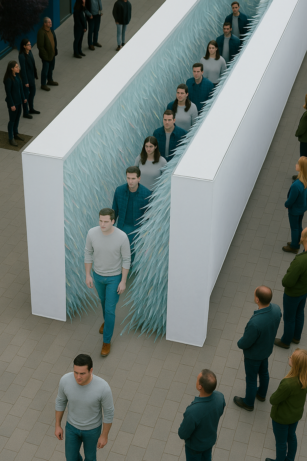 Para ello crearemos un gran túnel de viento, luz y aire por el que se invitará a los visitantes a internarse de manera que se sientan incómodamente acariciados por miles de tiras de plástico reciclado, acercándose hasta casi tocarnos.