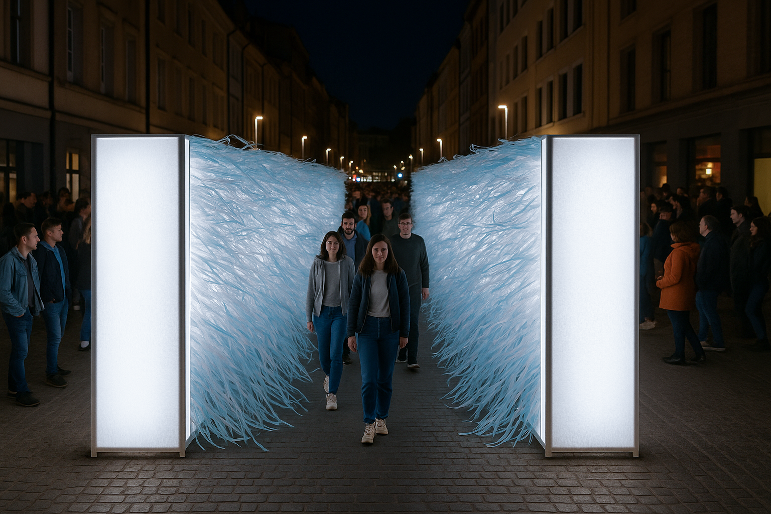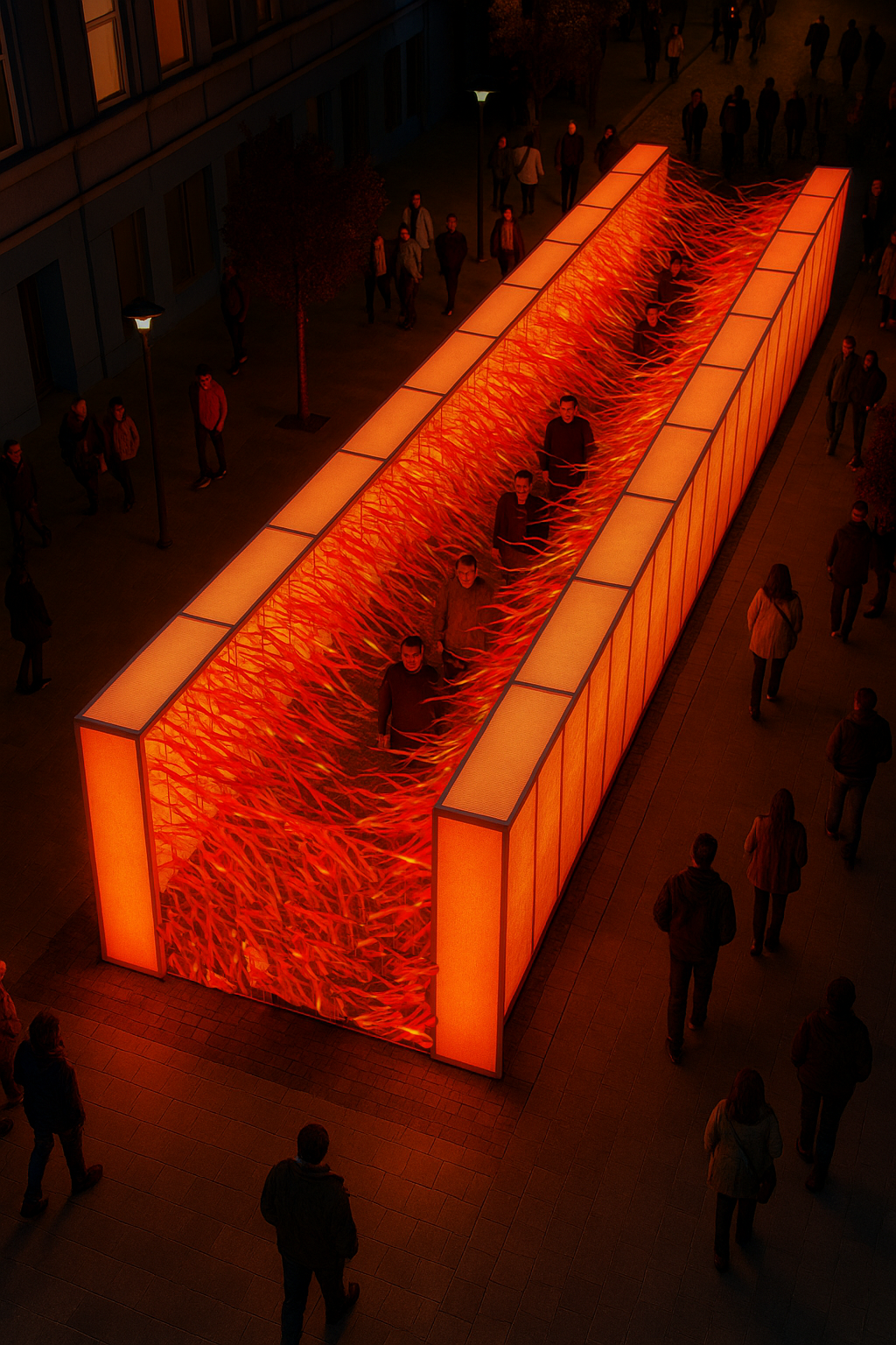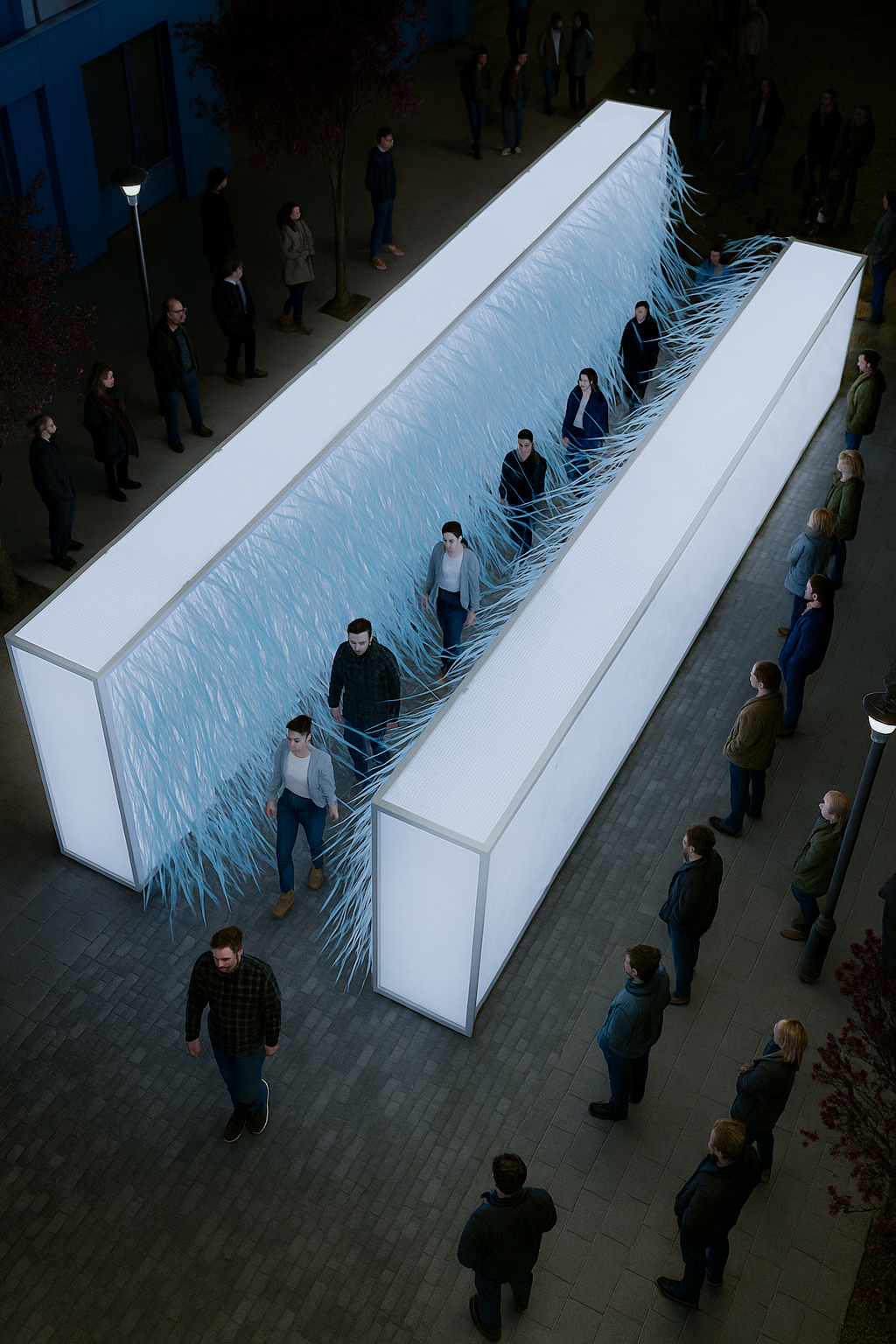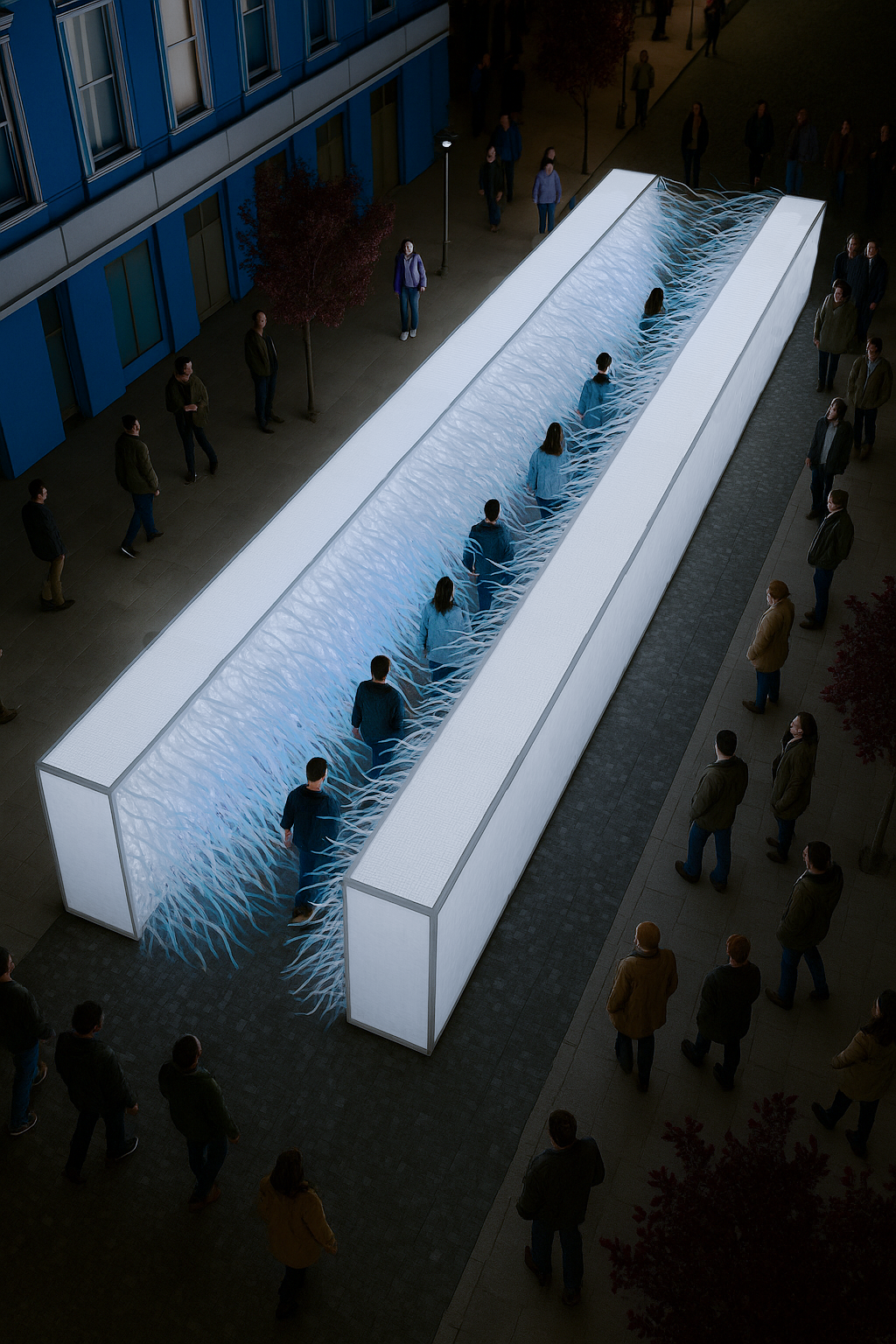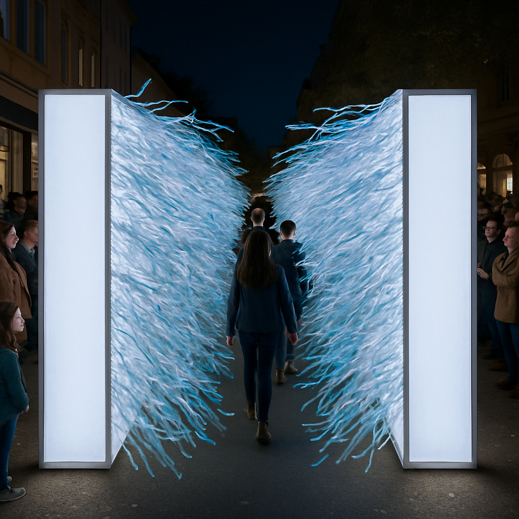 Para llevarlo a cabo esta idea, se crearán dos estructuras longitudinales blancas retroiluminada. Colocadas paralelas ocuparán un largo espacio de una calle o plaza, bloqueando su tráfico.