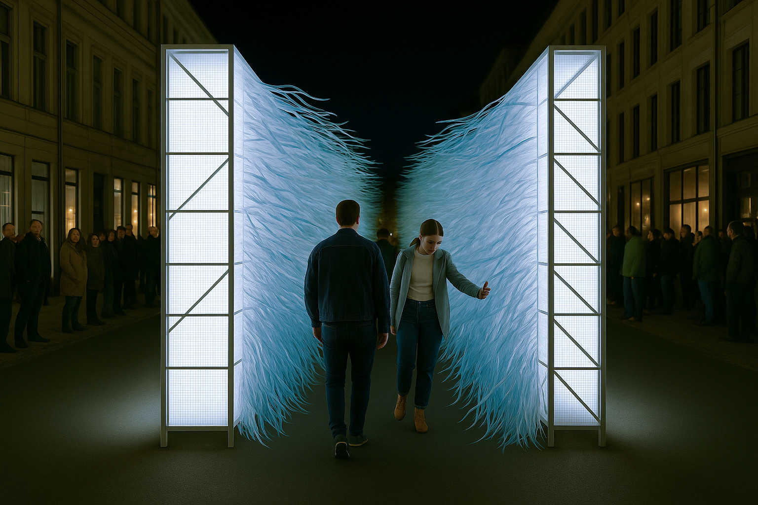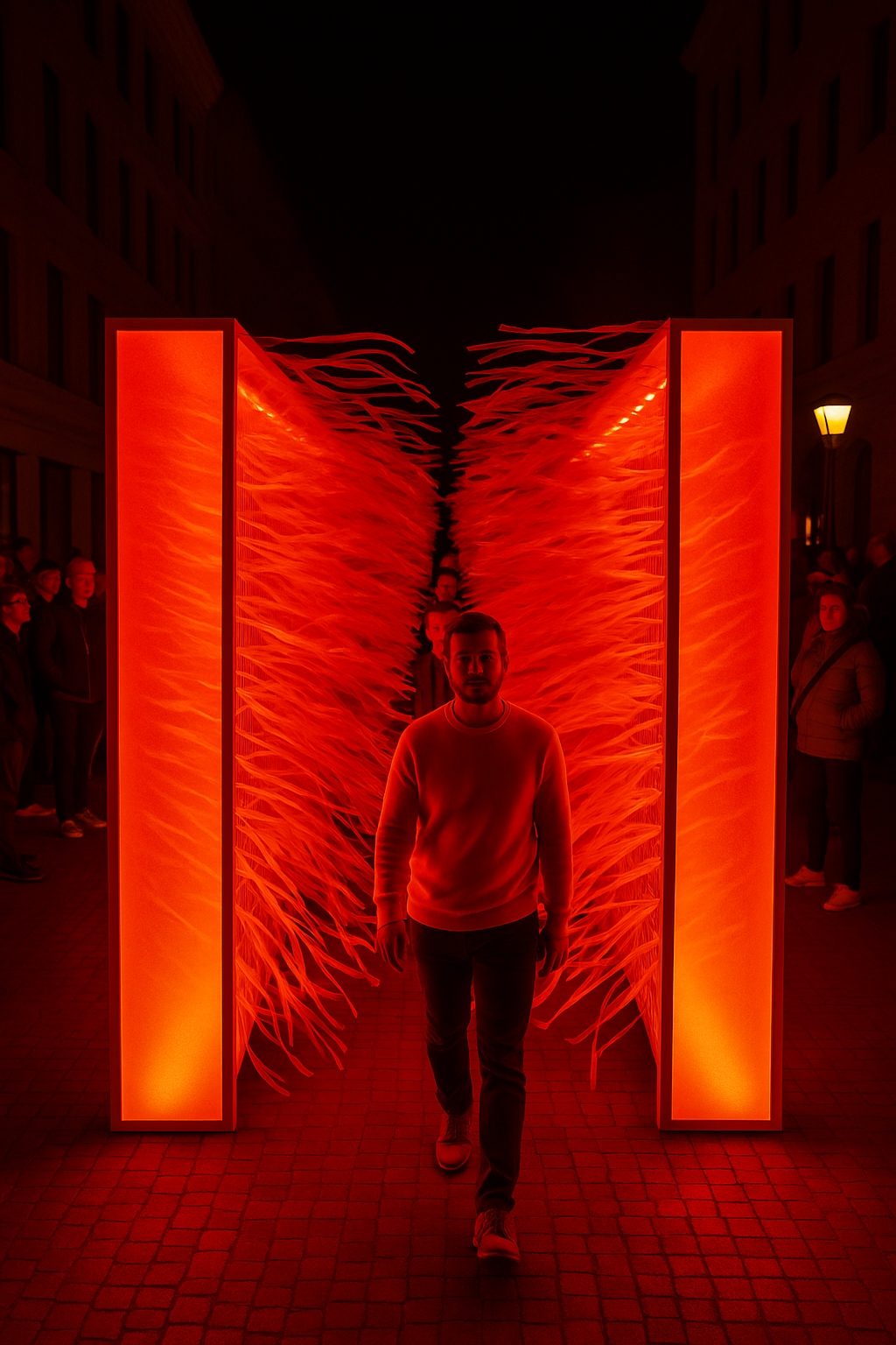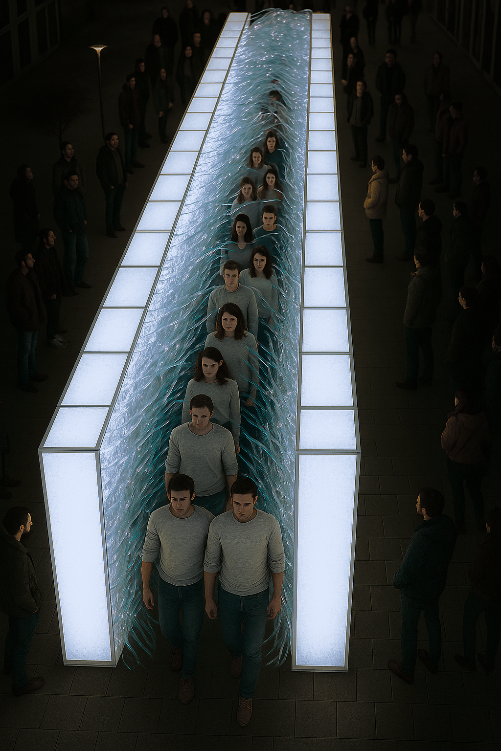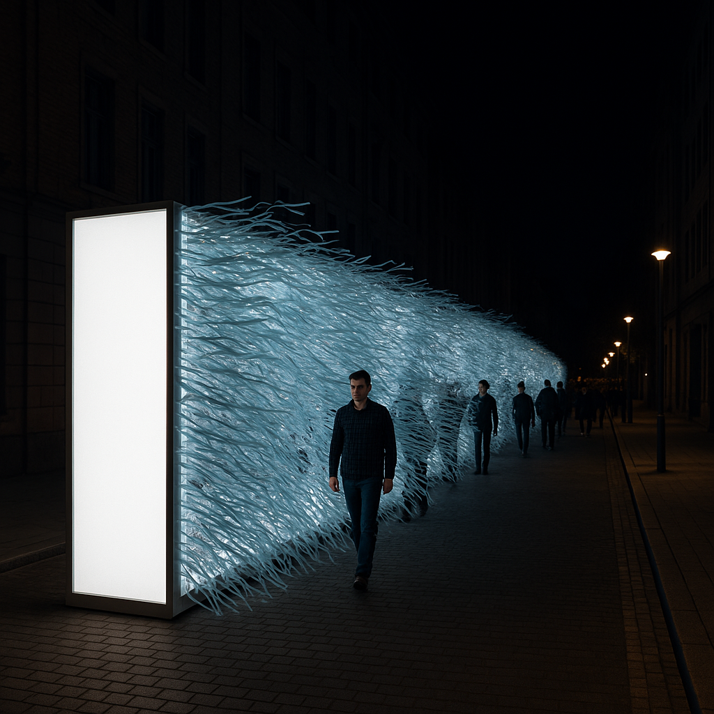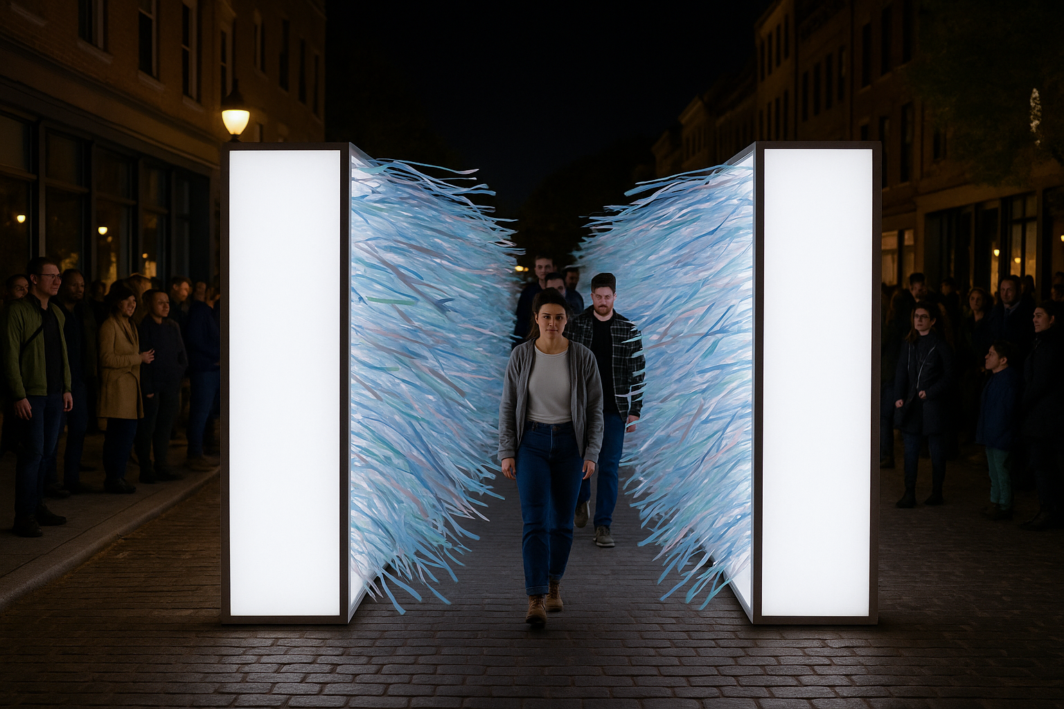 Para llevarlo a cabo esta idea, se crearán dos estructuras longitudinales blancas retroiluminada. Colocadas paralelas ocuparán un largo espacio de una calle o plaza, bloqueando su tráfico.