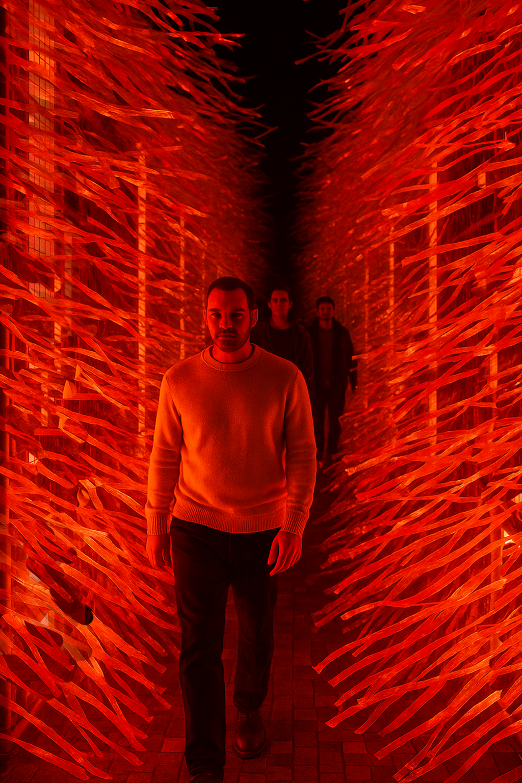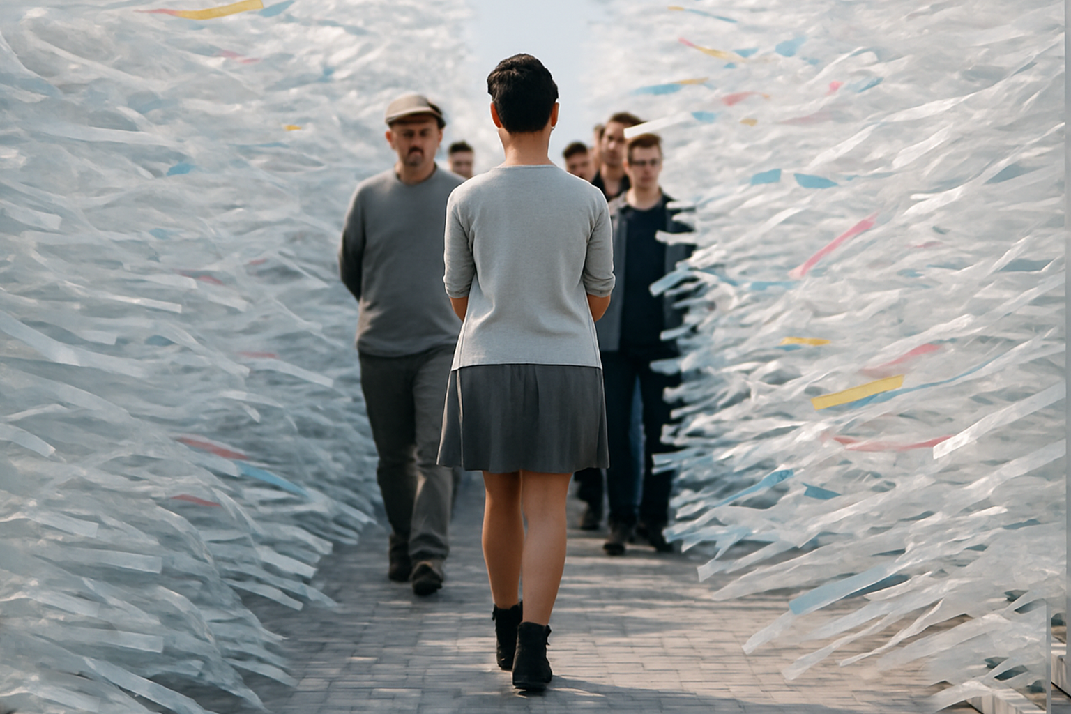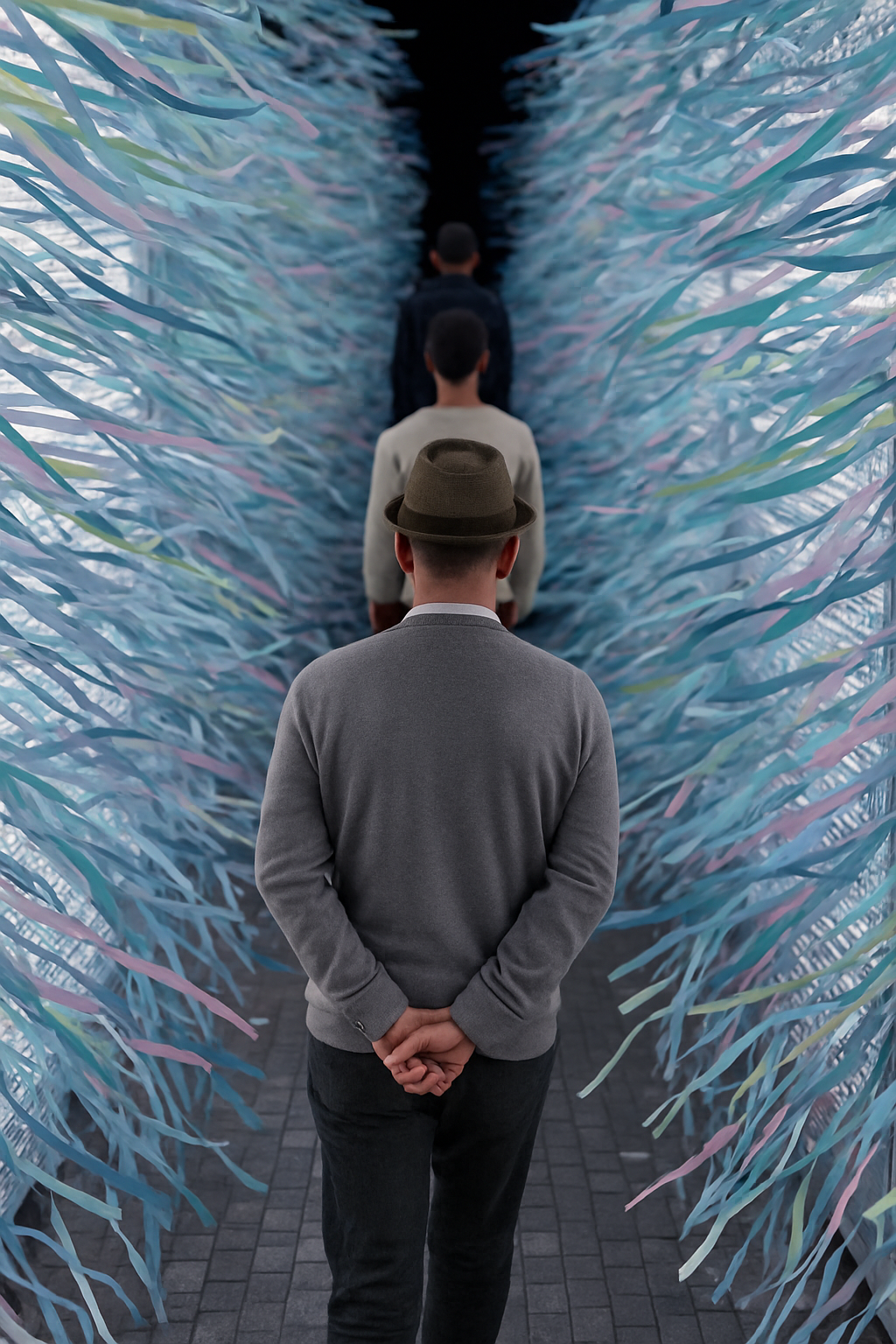 Este plástico movido por el viento creara un estrecho pasadizo, a modo de túnel de lavado, y en el que el olor, el aspecto y el sonido y el tiempo que se tarde en recorrerlo, propicie que salgamos un poco mas inquietos que cuando entramos.