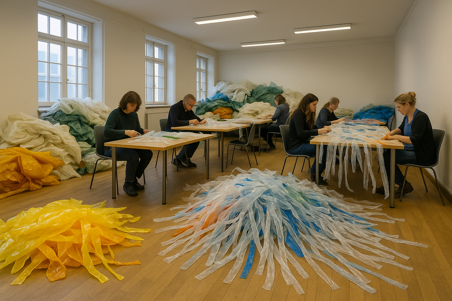 Con la pieza «Ráfagas de plástico que ocupan el aire» queremos visibilidad la amenaza física que el exceso de plástico ejerce sobre nosotros ocupando nuestro espacio vital e imponiéndose con una presencia amenazadora.