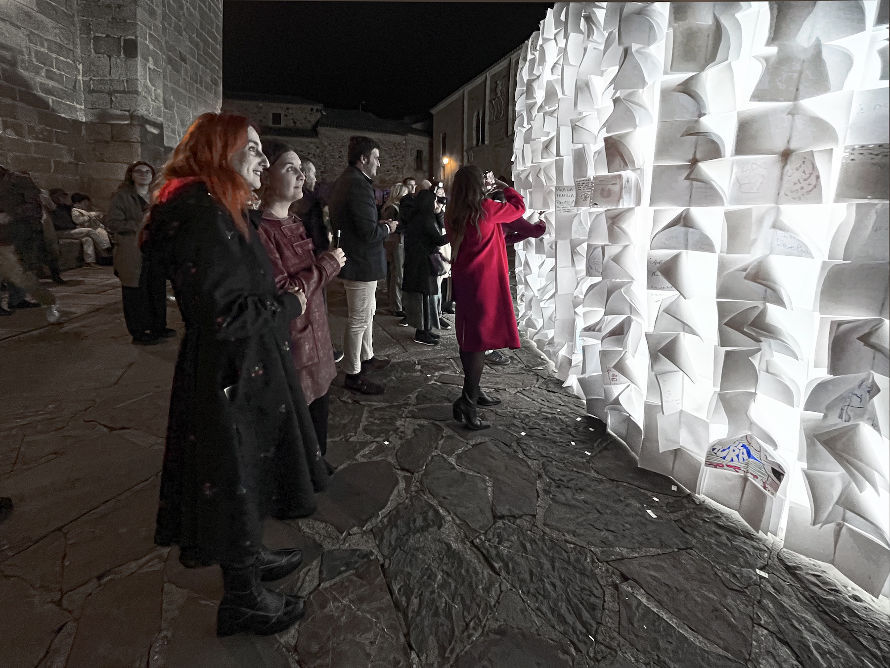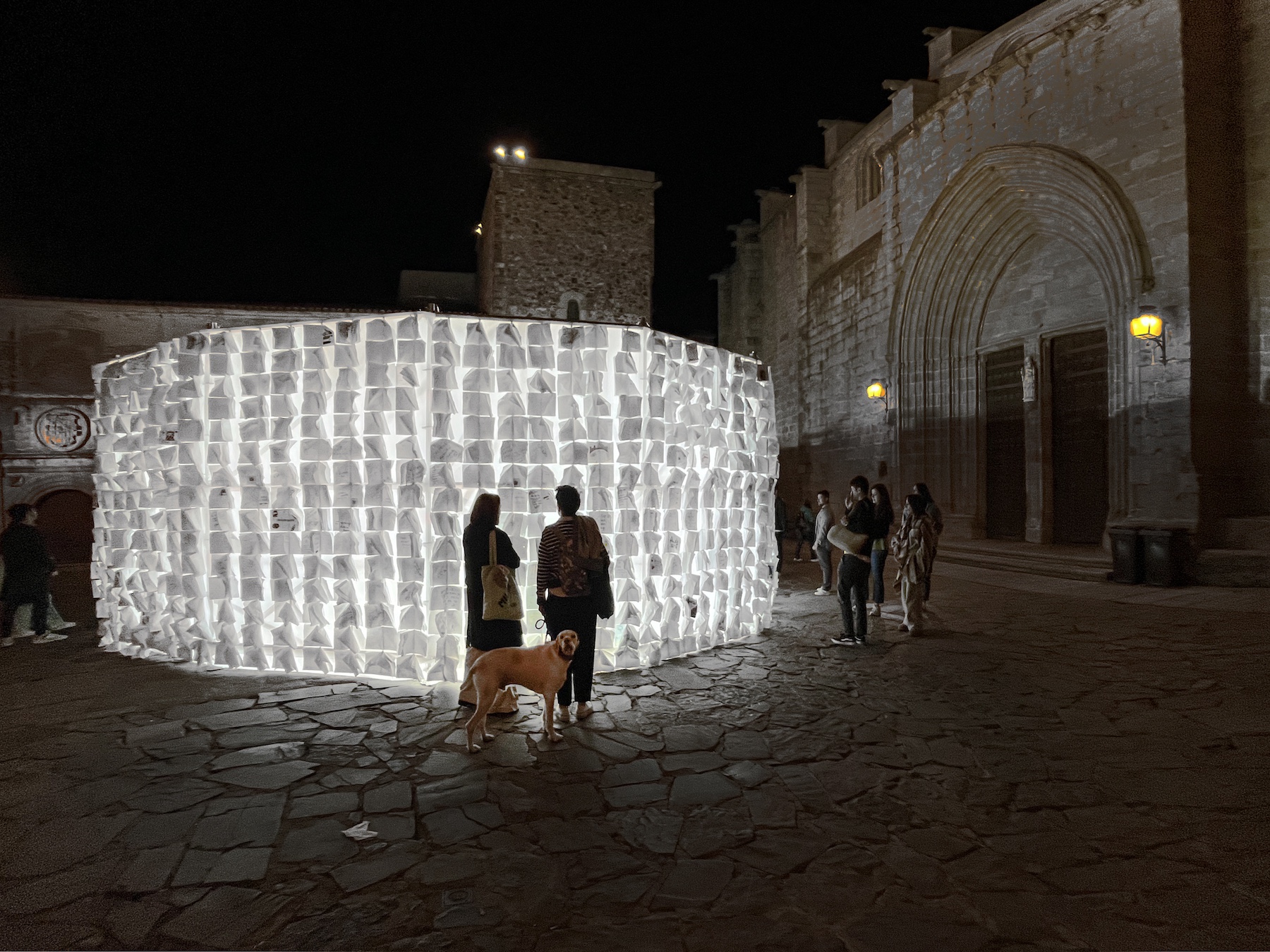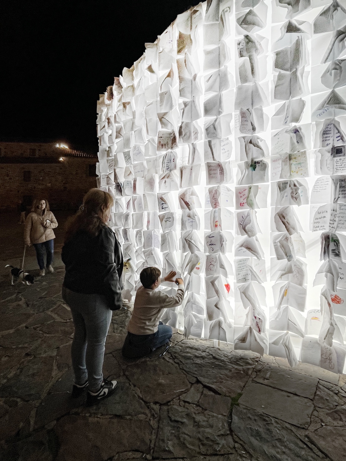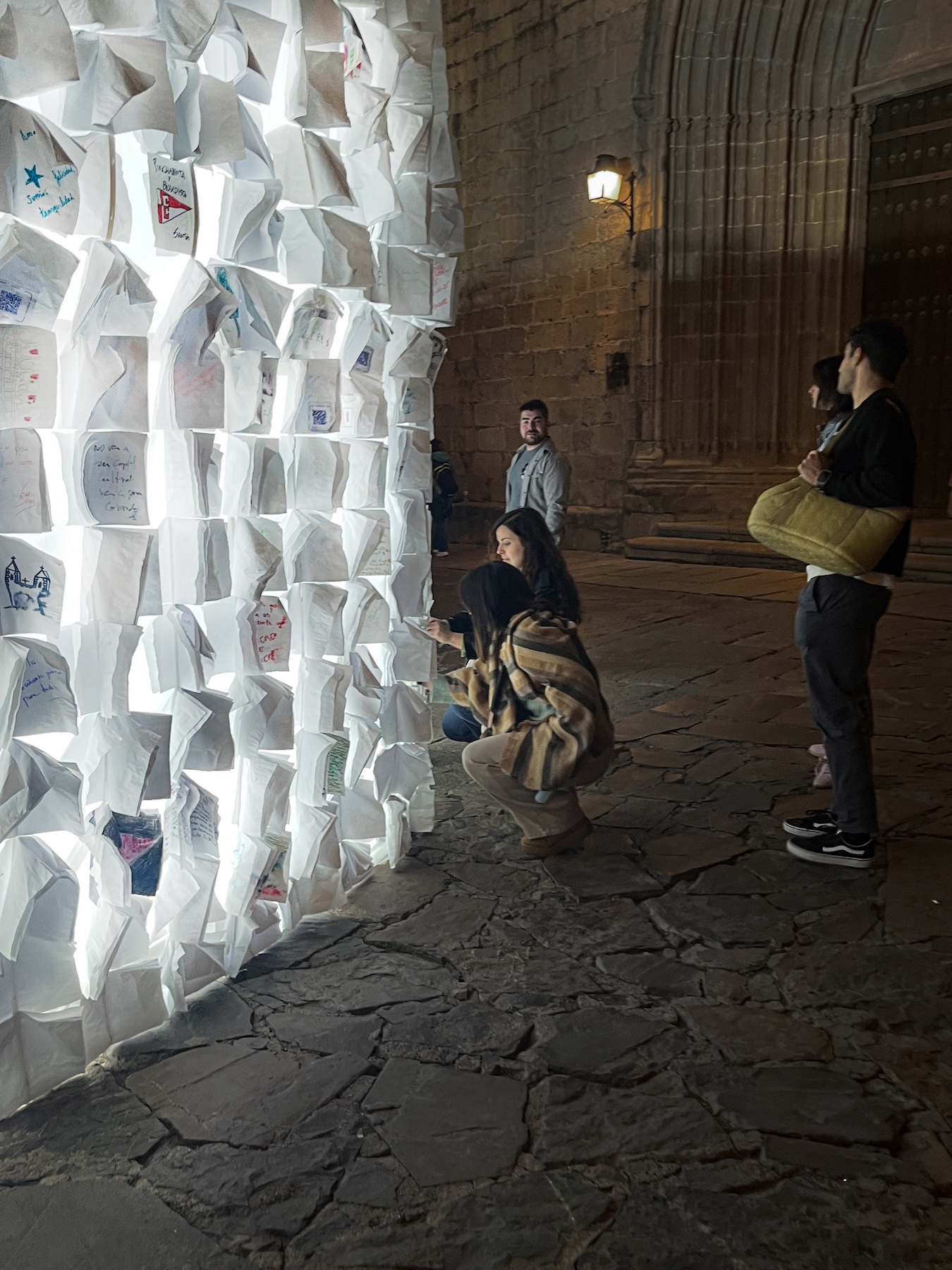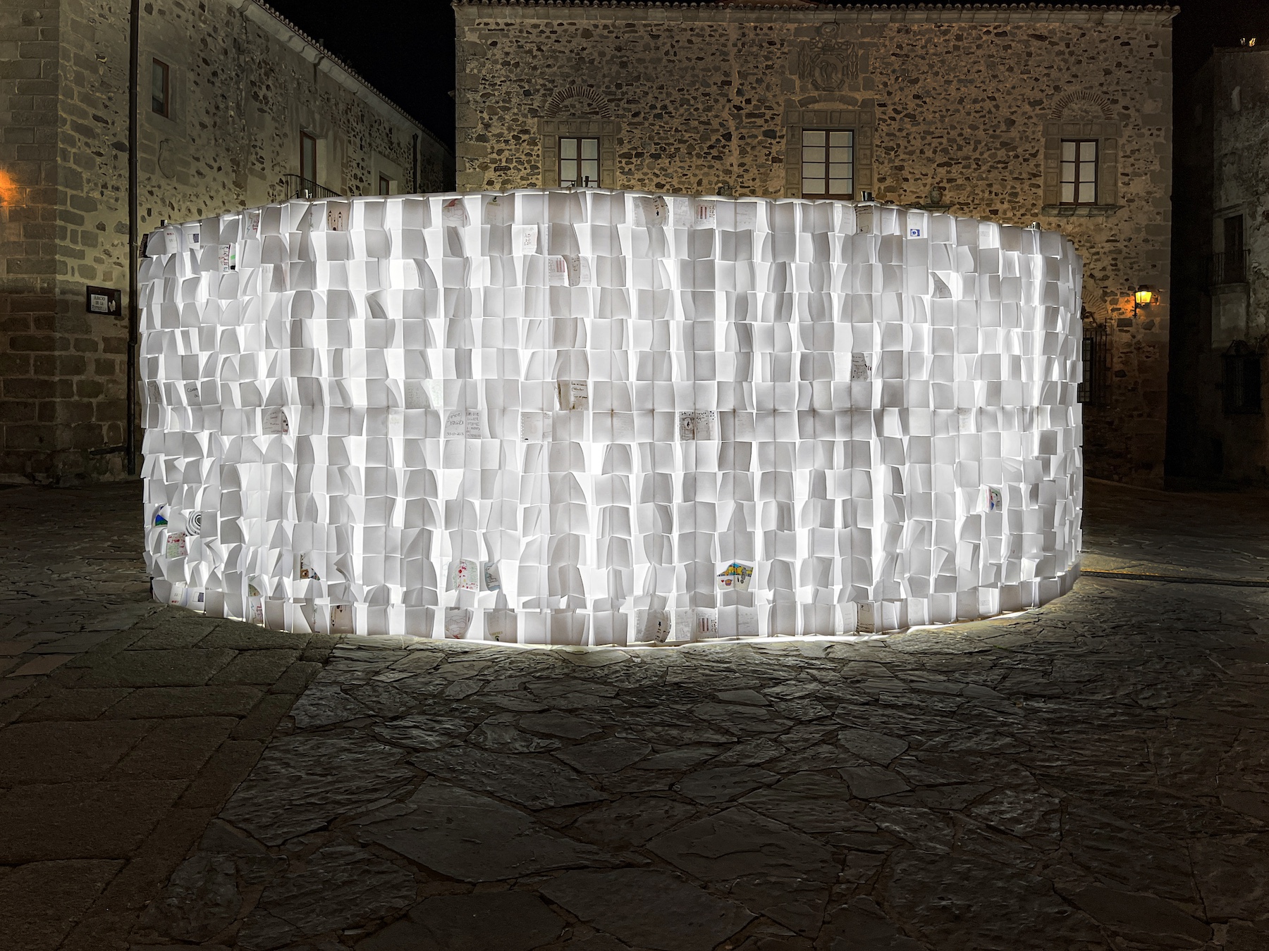 For three days, the piece took over Plaza de Santa María with a large circular wall covered in thousands of notebooks filled with messages from citizens. The structure, illuminated from within, functioned as a collective archive and a wall of free expression—something the public could write on and transform. The wind rustled the pages, creating an unpredictable collage of shared thoughts and reflections.