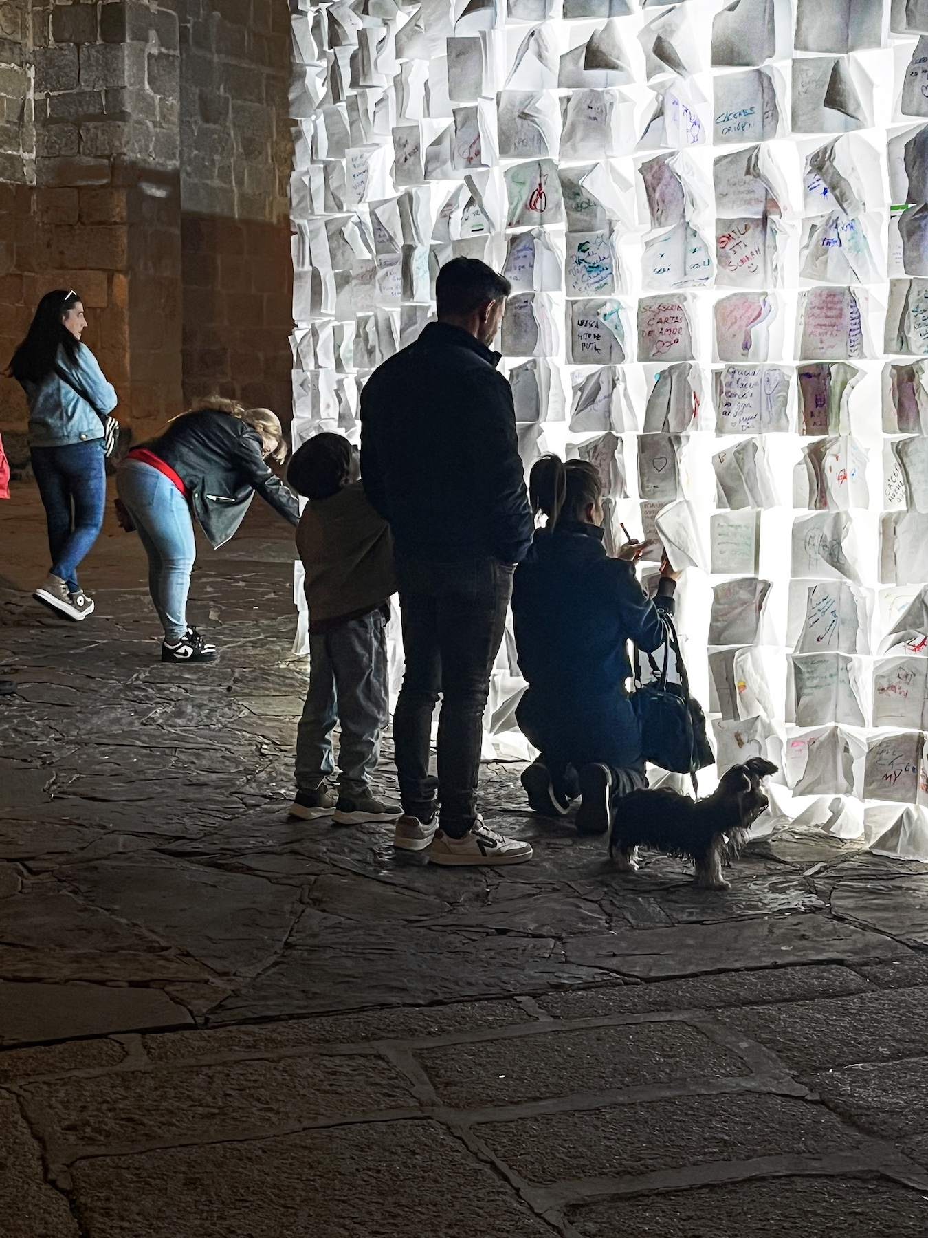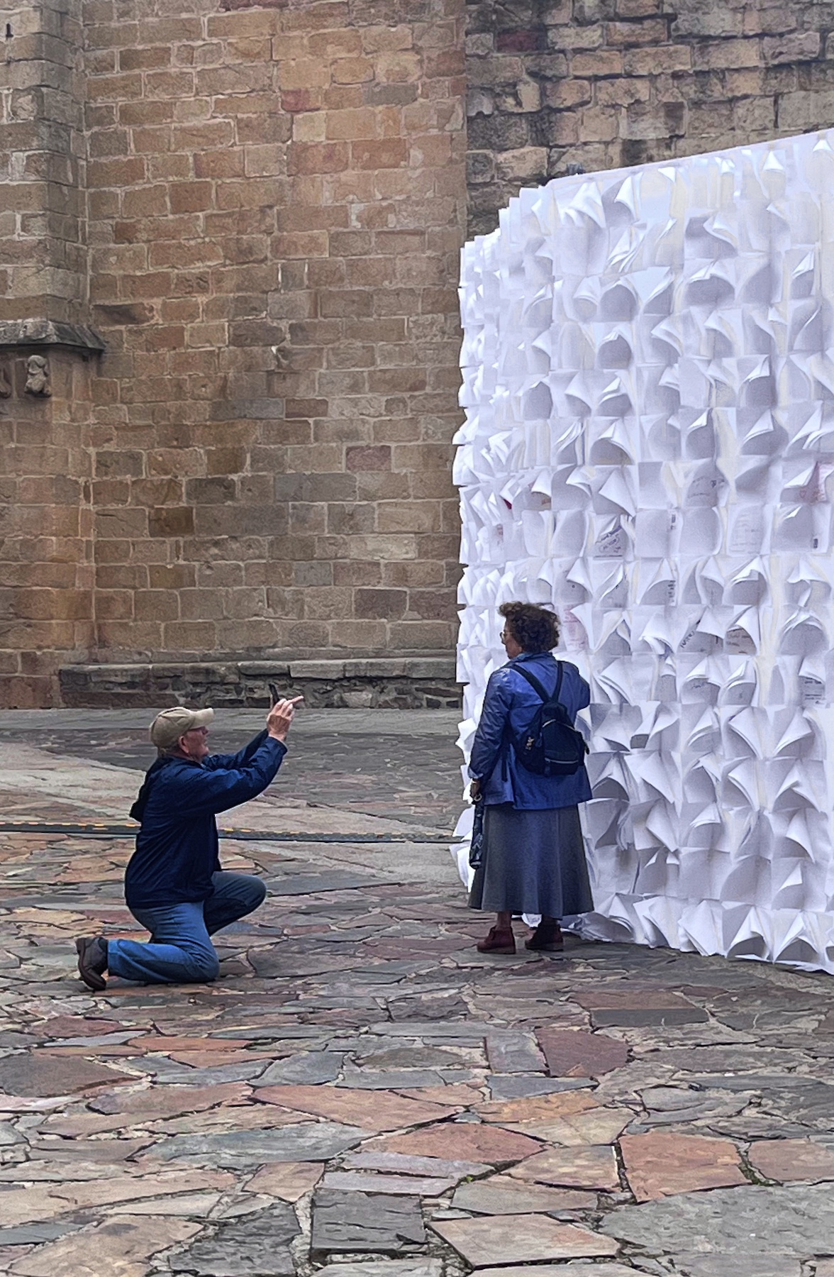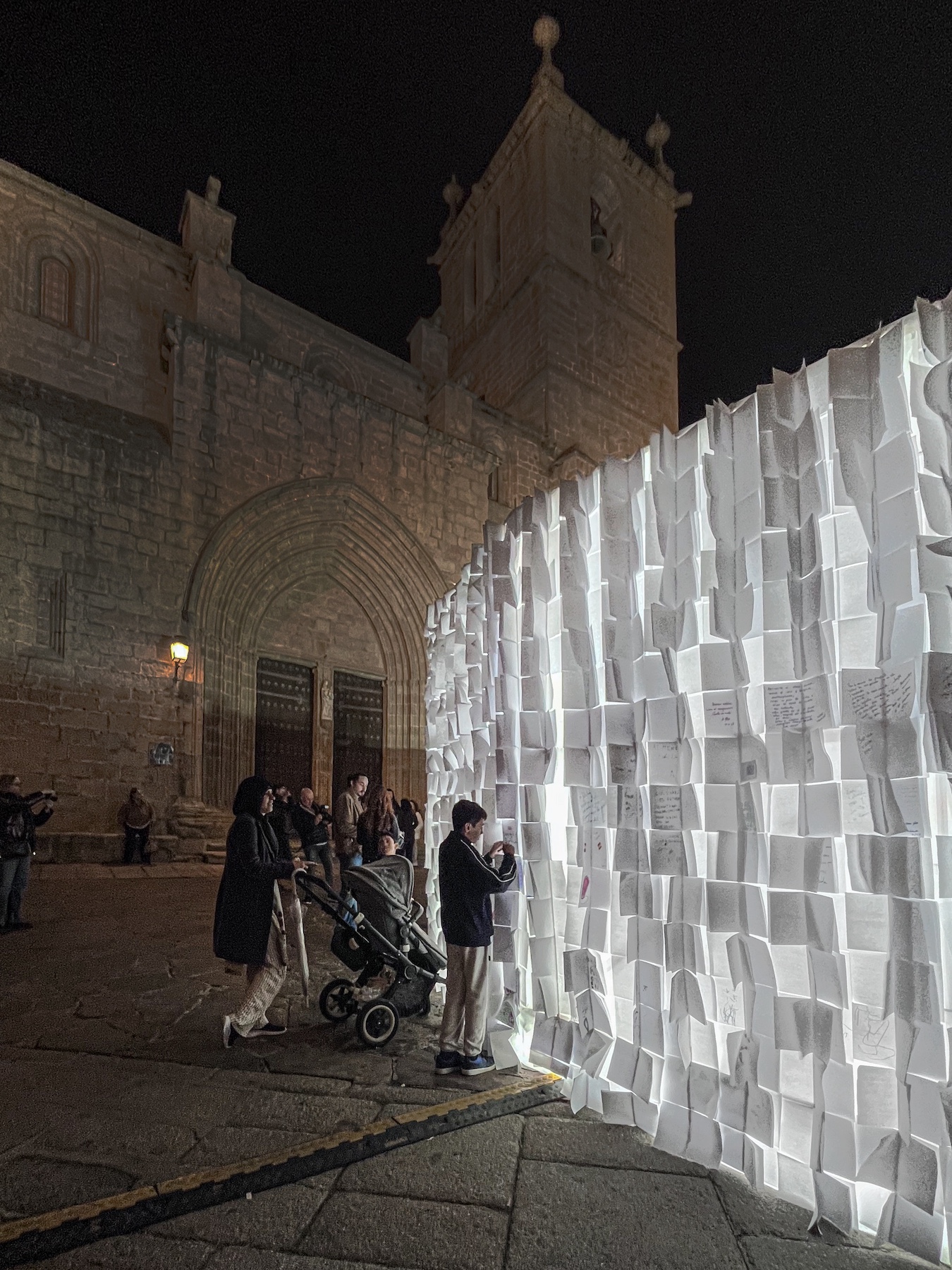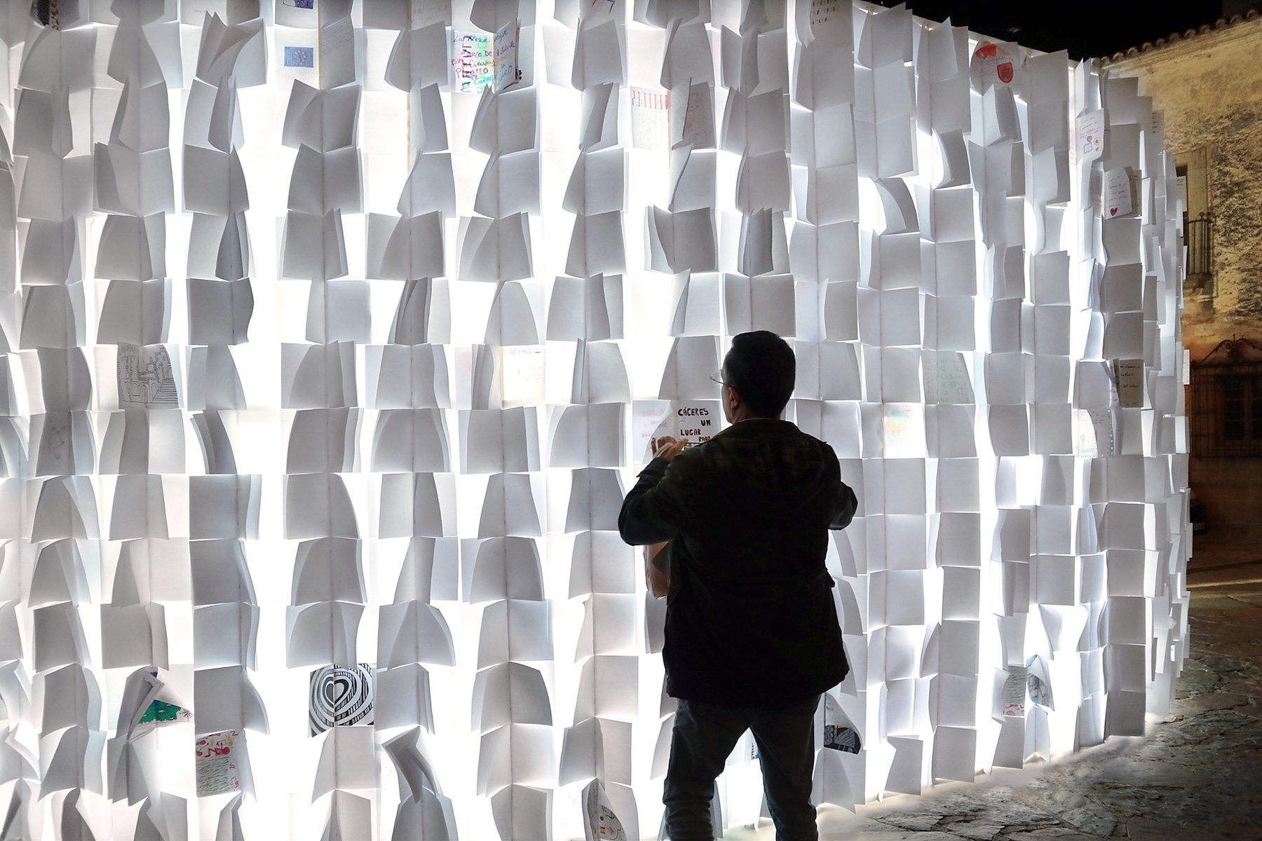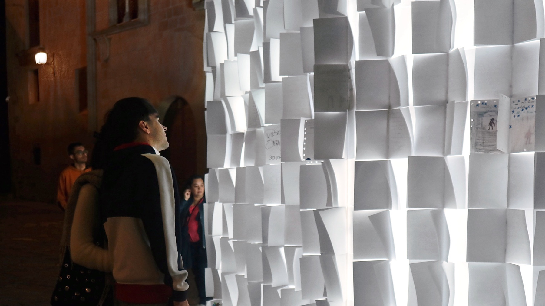 For three days, the piece took over Plaza de Santa María with a large circular wall covered in thousands of notebooks filled with messages from citizens. The structure, illuminated from within, functioned as a collective archive and a wall of free expression—something the public could write on and transform. The wind rustled the pages, creating an unpredictable collage of shared thoughts and reflections.
