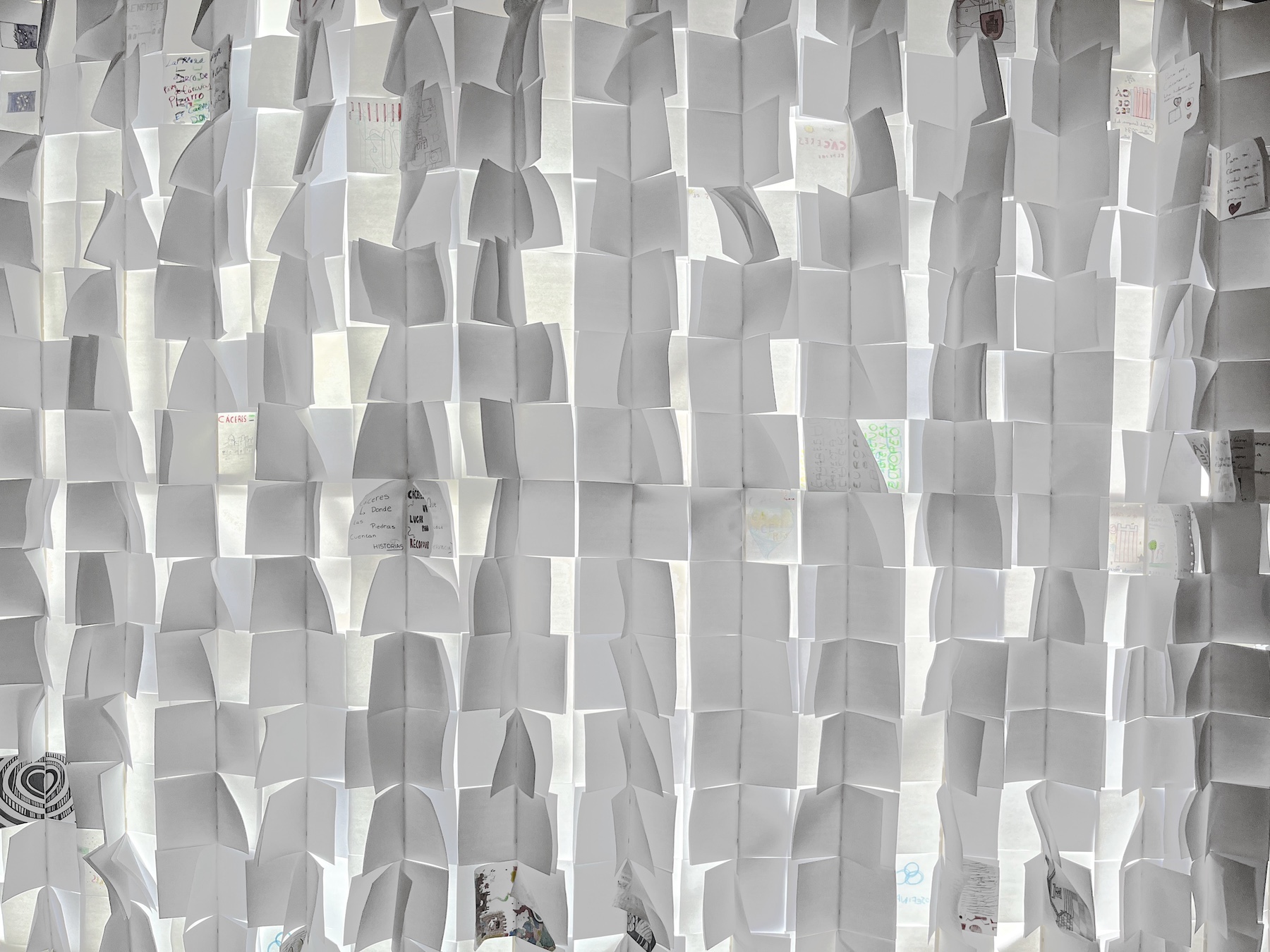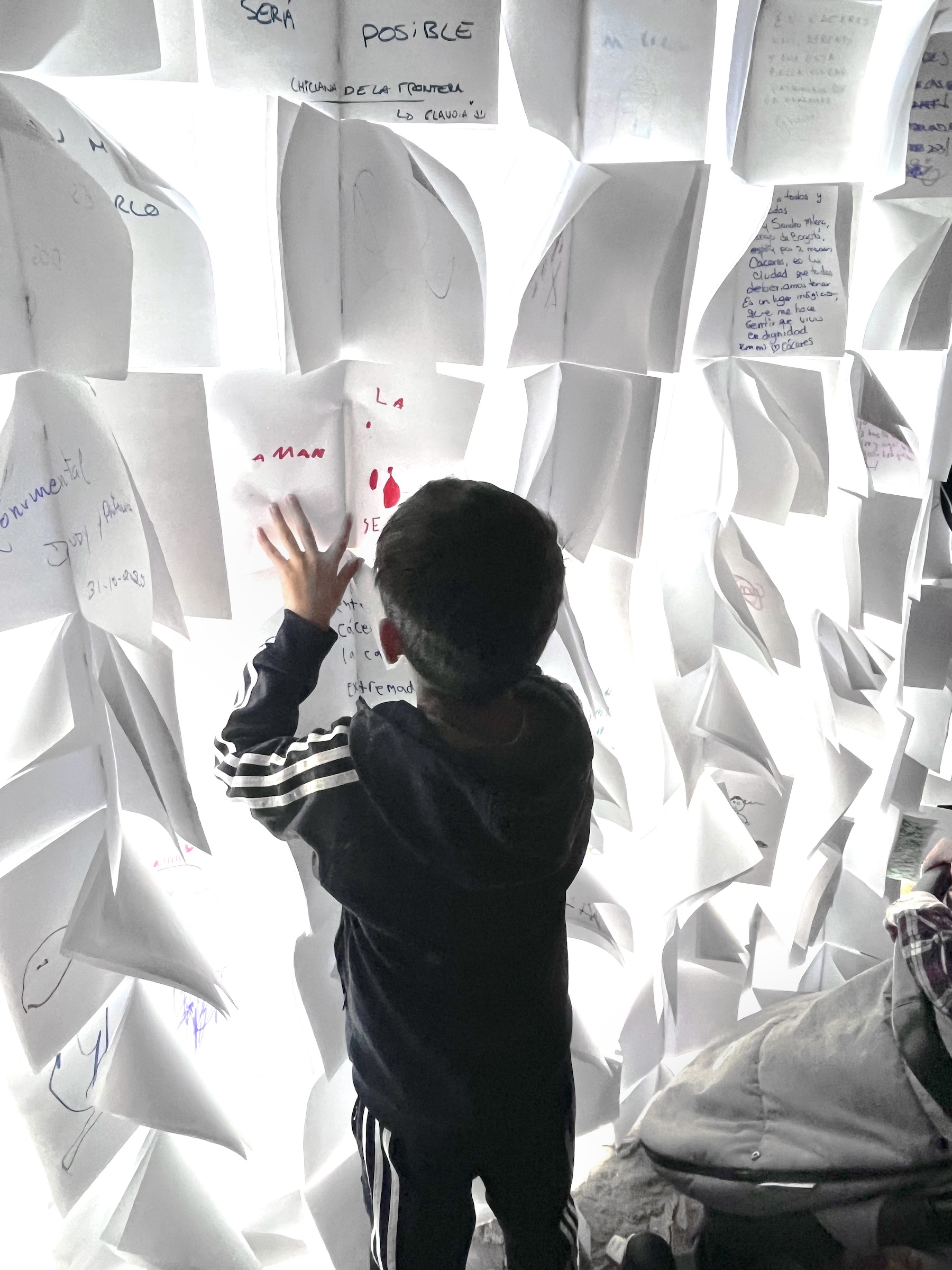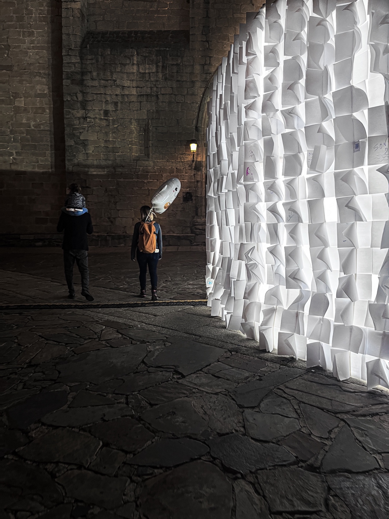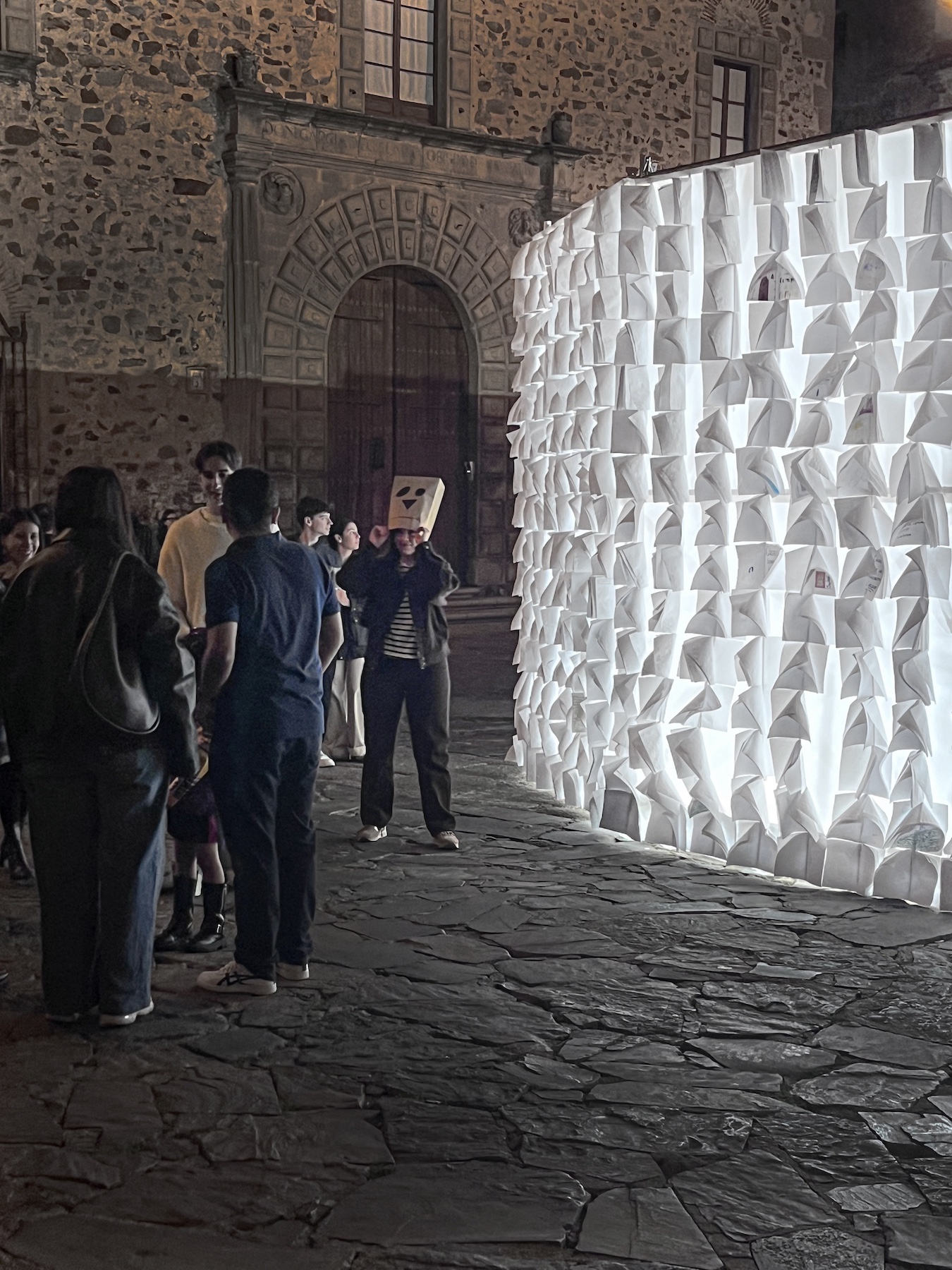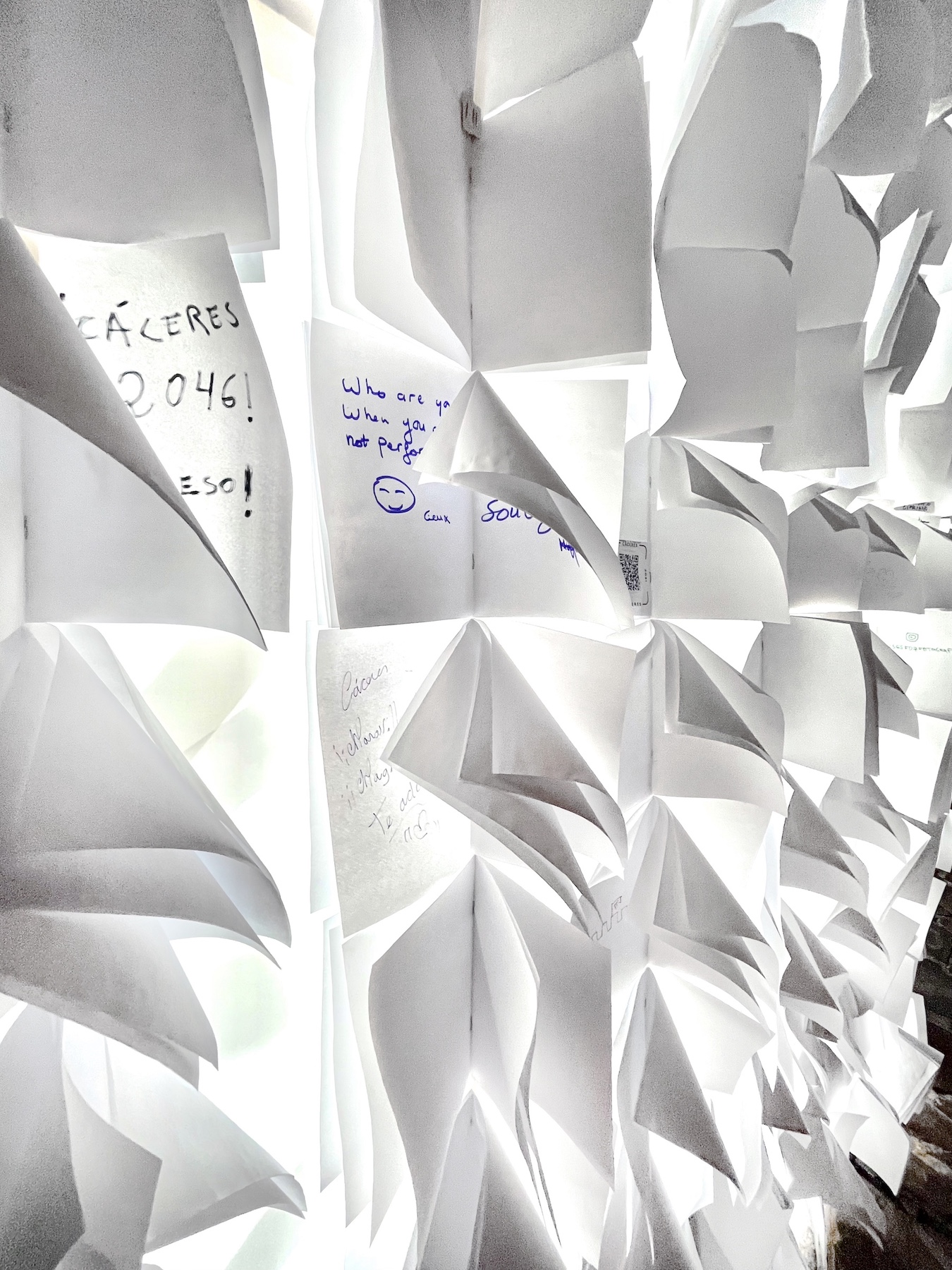For three days, the piece took over Plaza de Santa María with a large circular wall covered in thousands of notebooks filled with messages from citizens. The structure, illuminated from within, functioned as a collective archive and a wall of free expression—something the public could write on and transform. The wind rustled the pages, creating an unpredictable collage of shared thoughts and reflections.