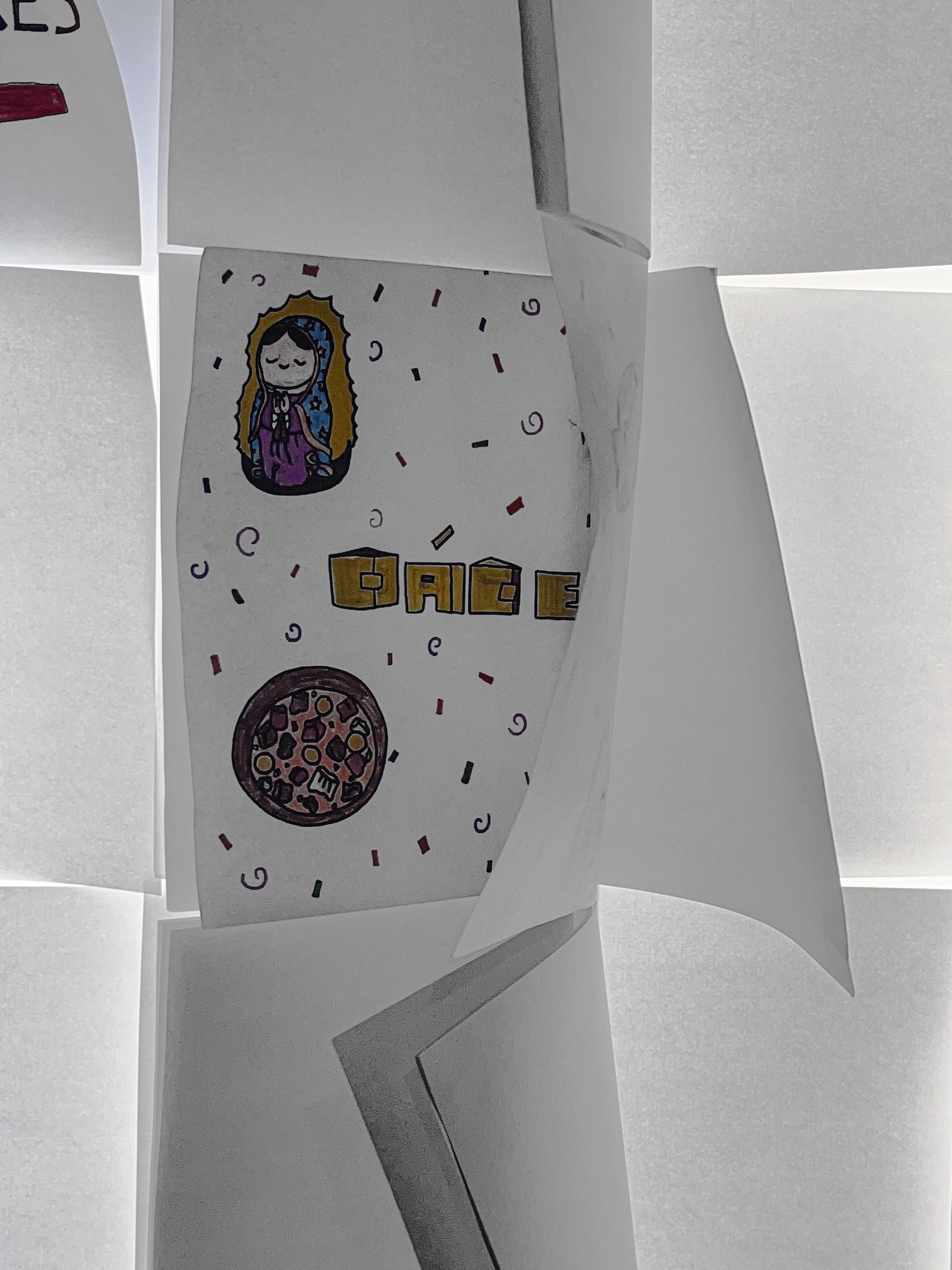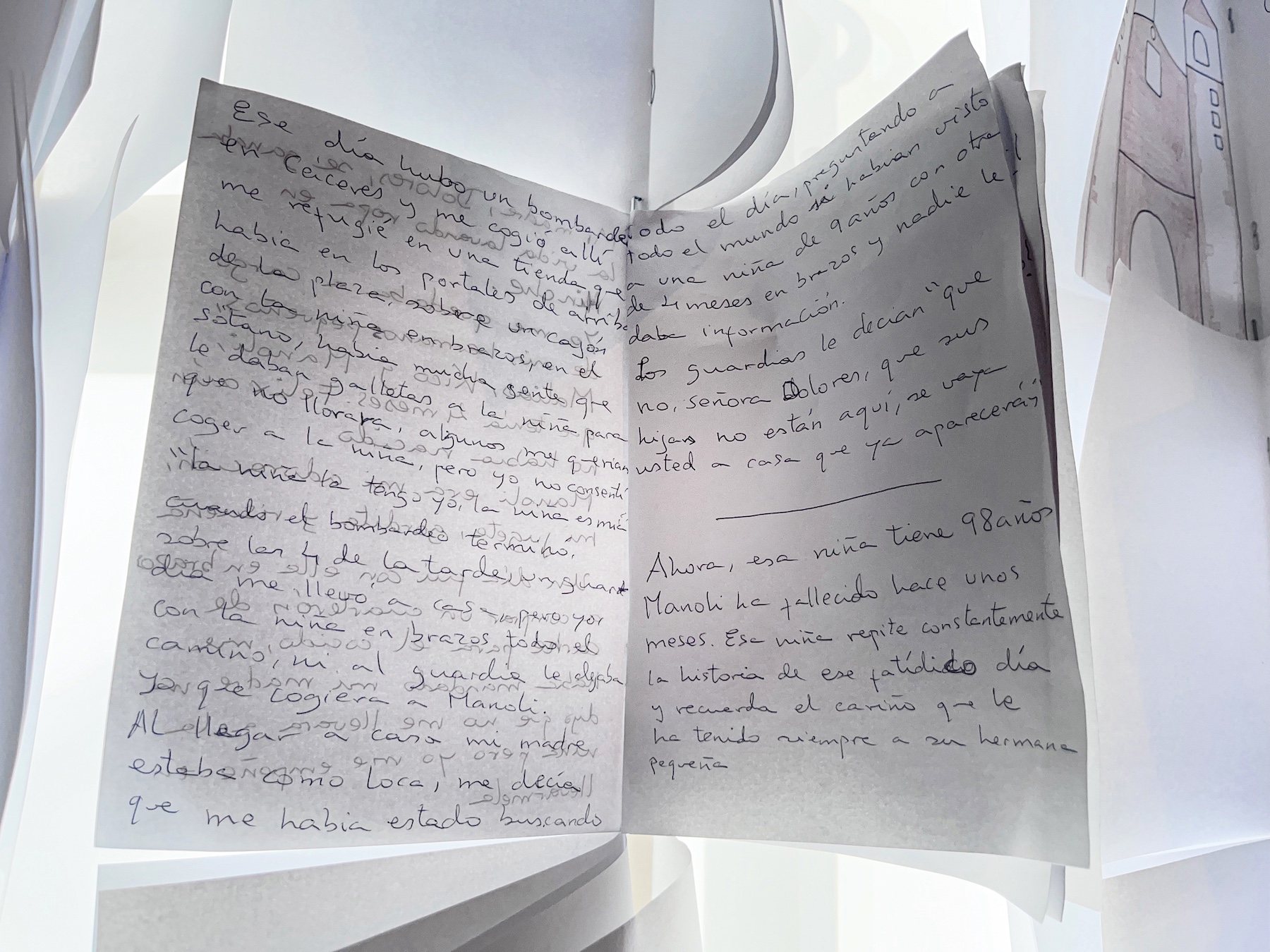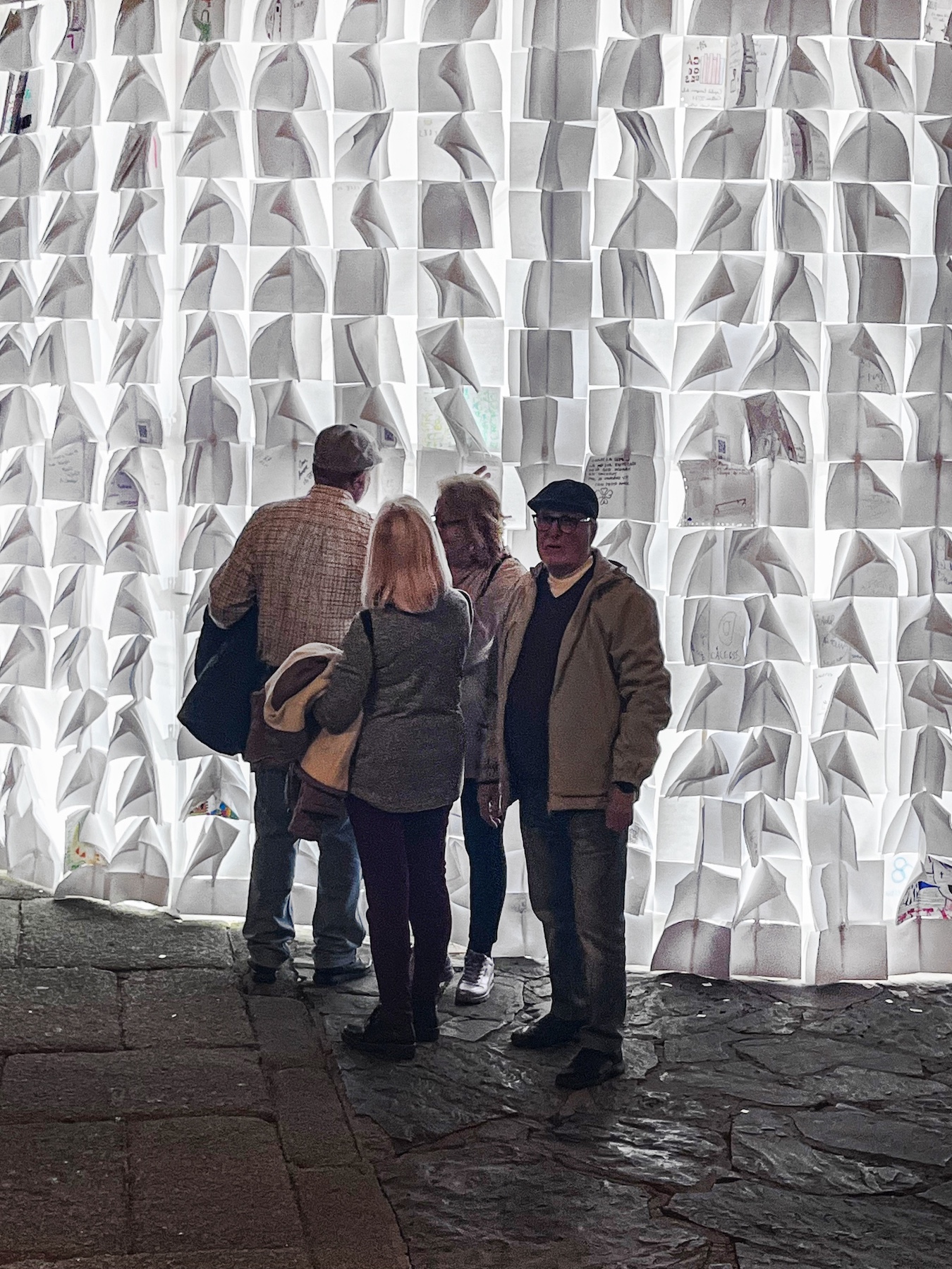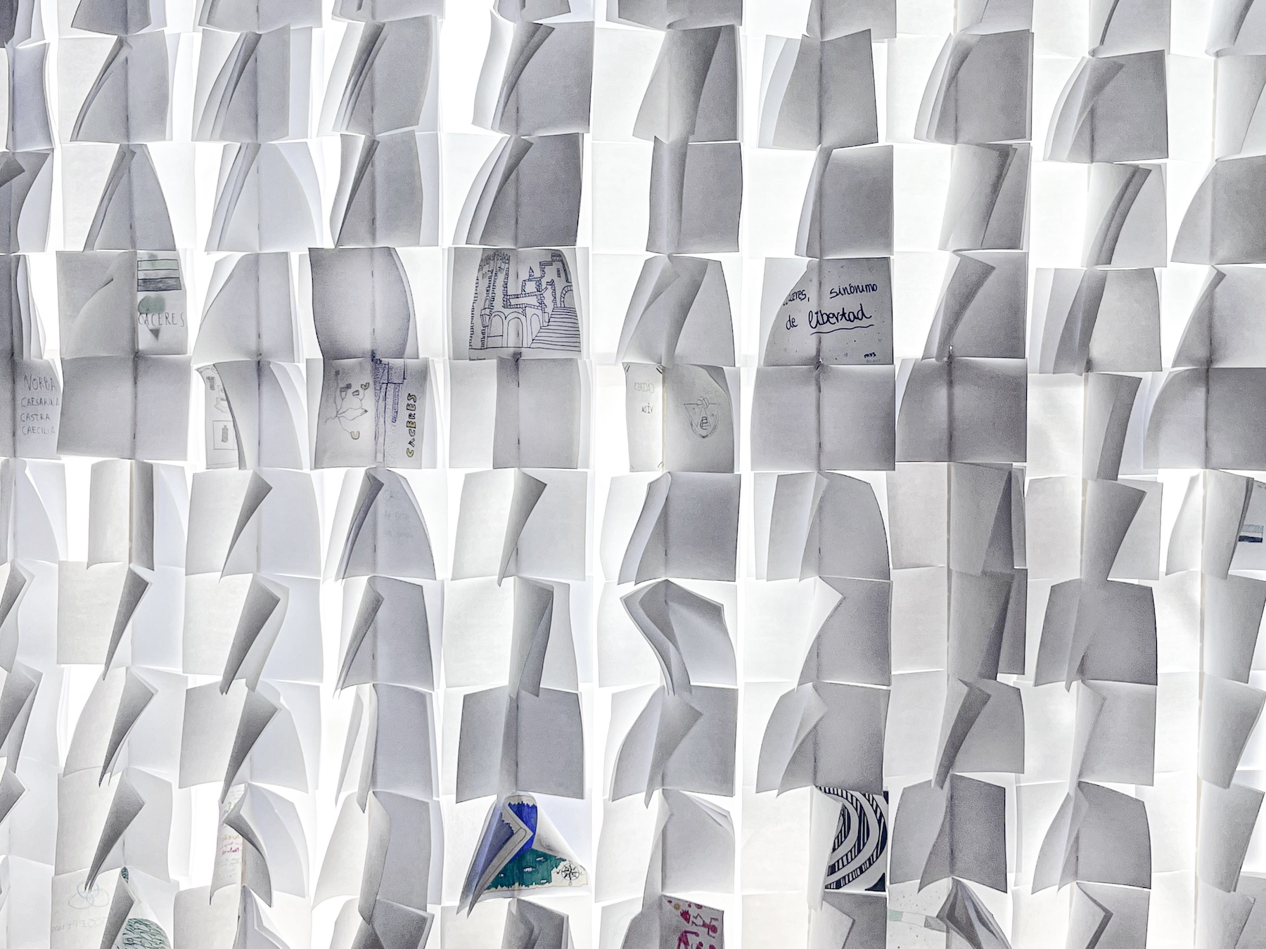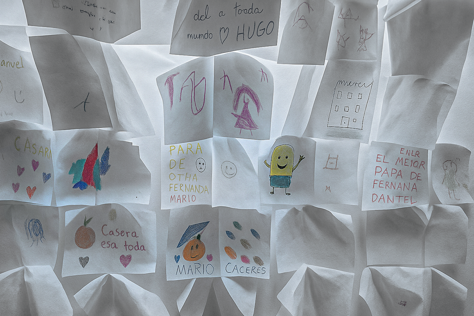 For three days, the piece took over Plaza de Santa María with a large circular wall covered in thousands of notebooks filled with messages from citizens. The structure, illuminated from within, functioned as a collective archive and a wall of free expression—something the public could write on and transform. The wind rustled the pages, creating an unpredictable collage of shared thoughts and reflections.
