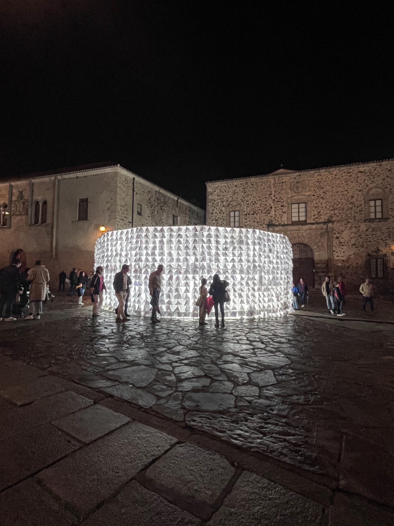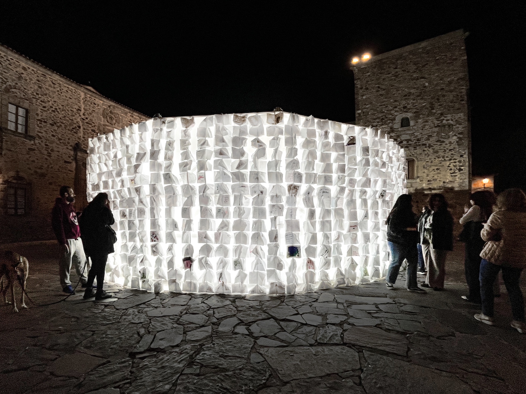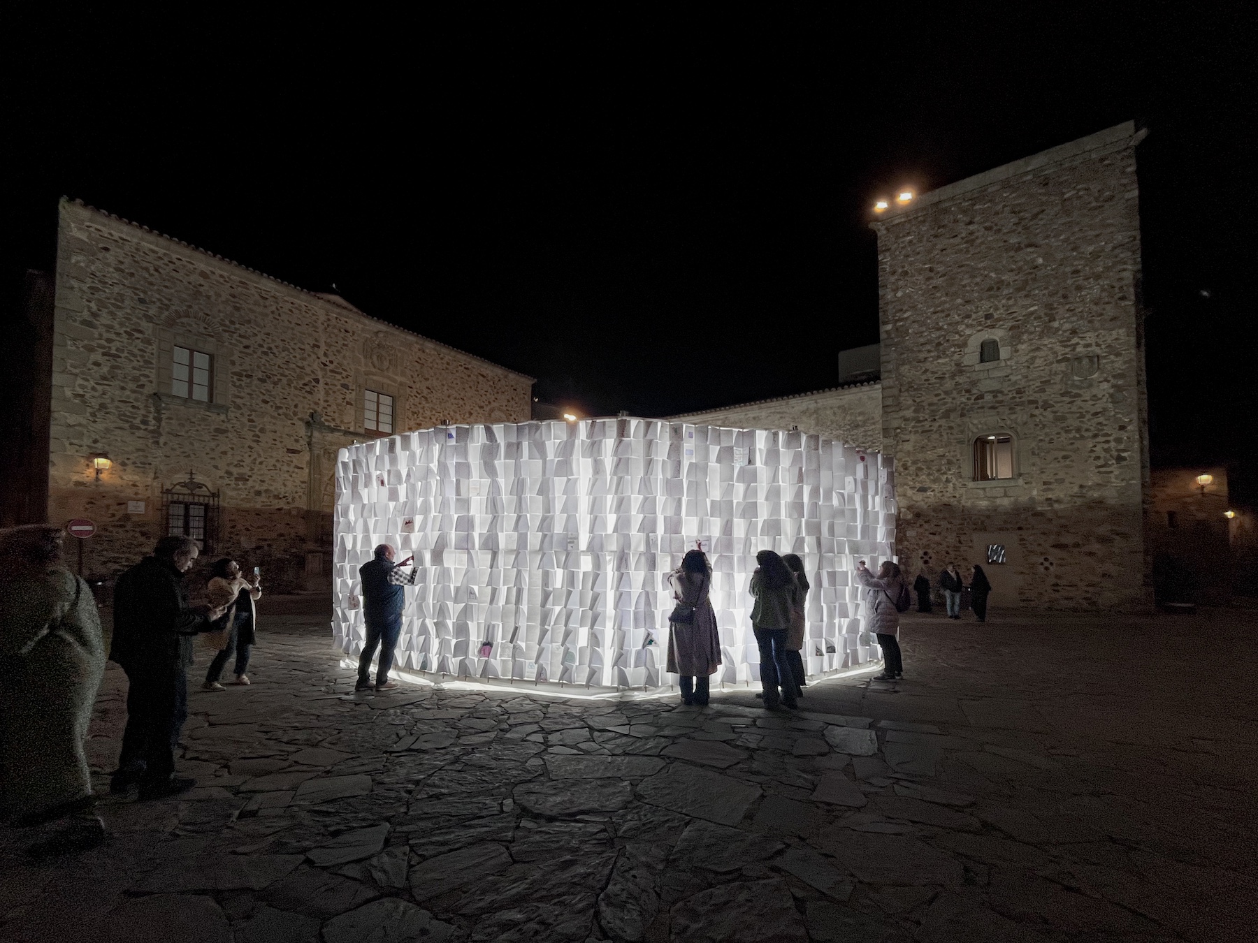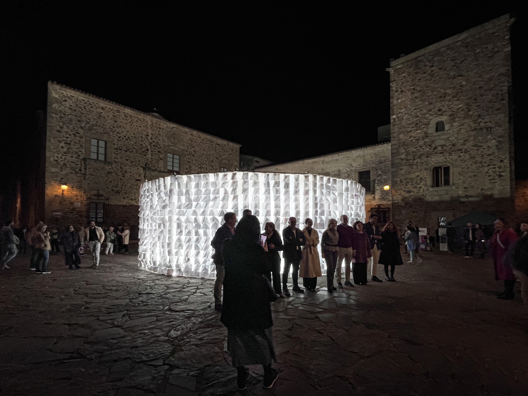 El pasado mes de noviembre fuimos invitados a trabajar en Cáceres con nuestra pieza “En hojas blancas”. La instalación inauguró las actividades con las que la ciudad arranca su candidatura para convertirse en Capital Europea de la Cultura 2031.