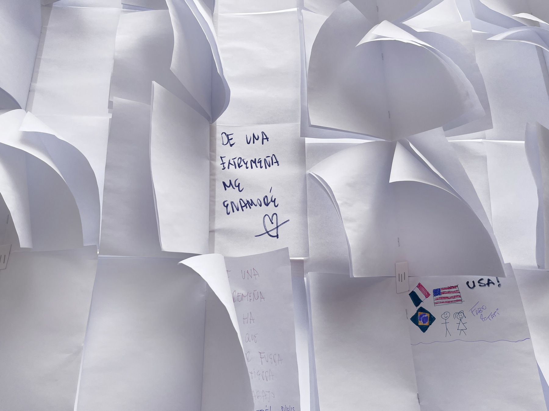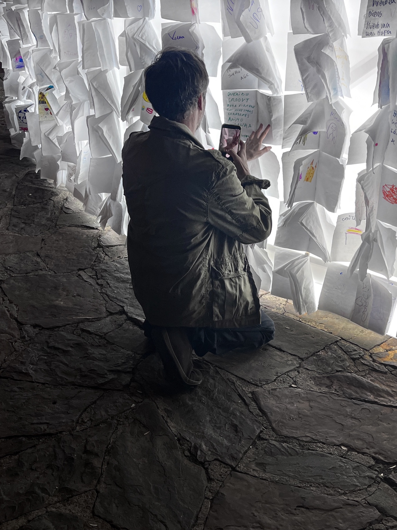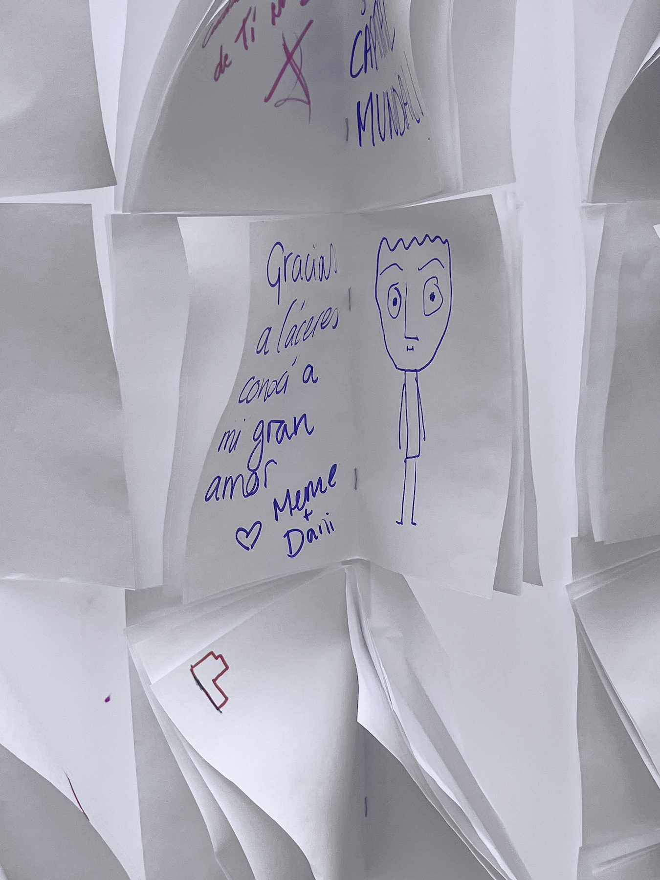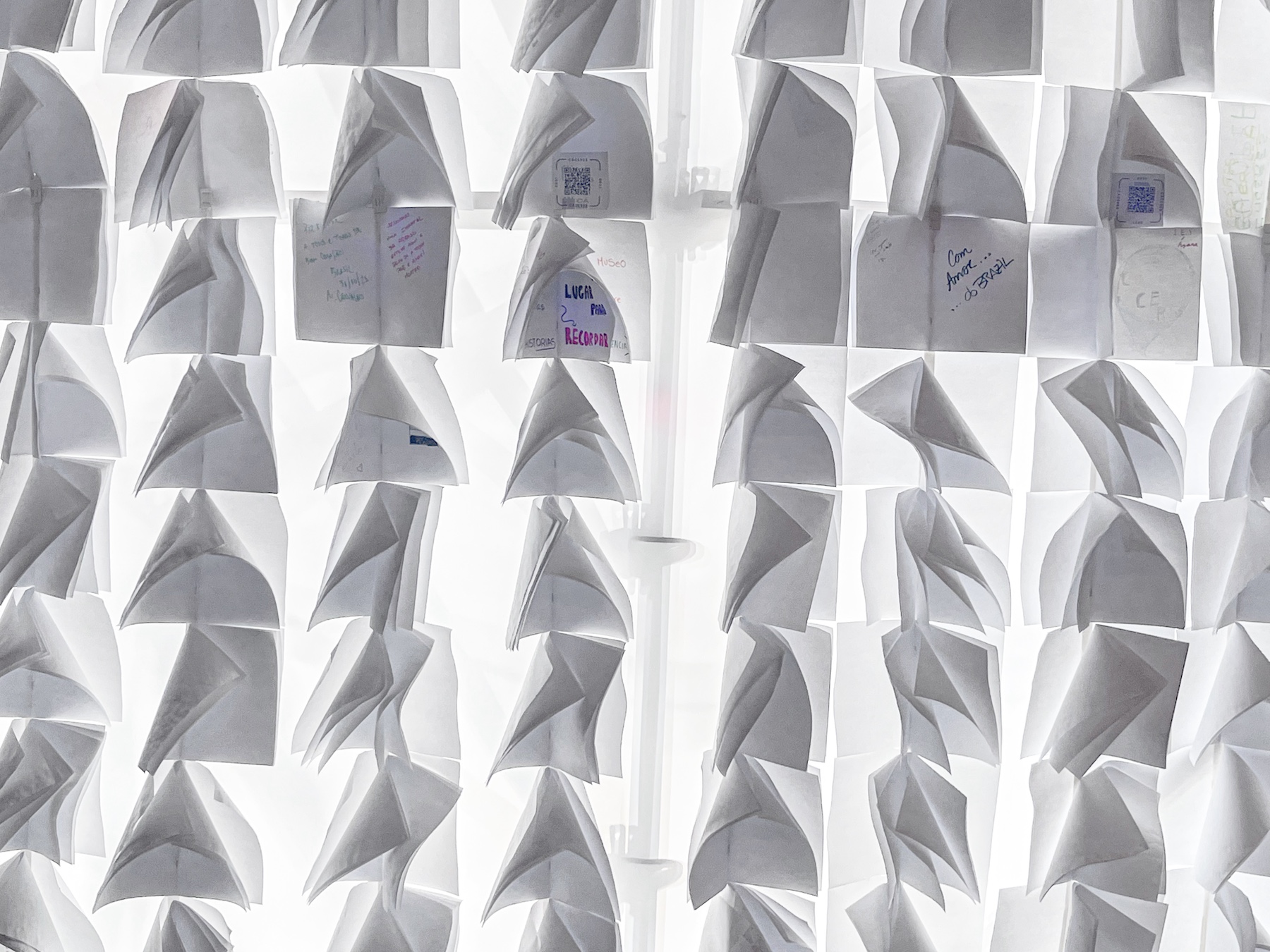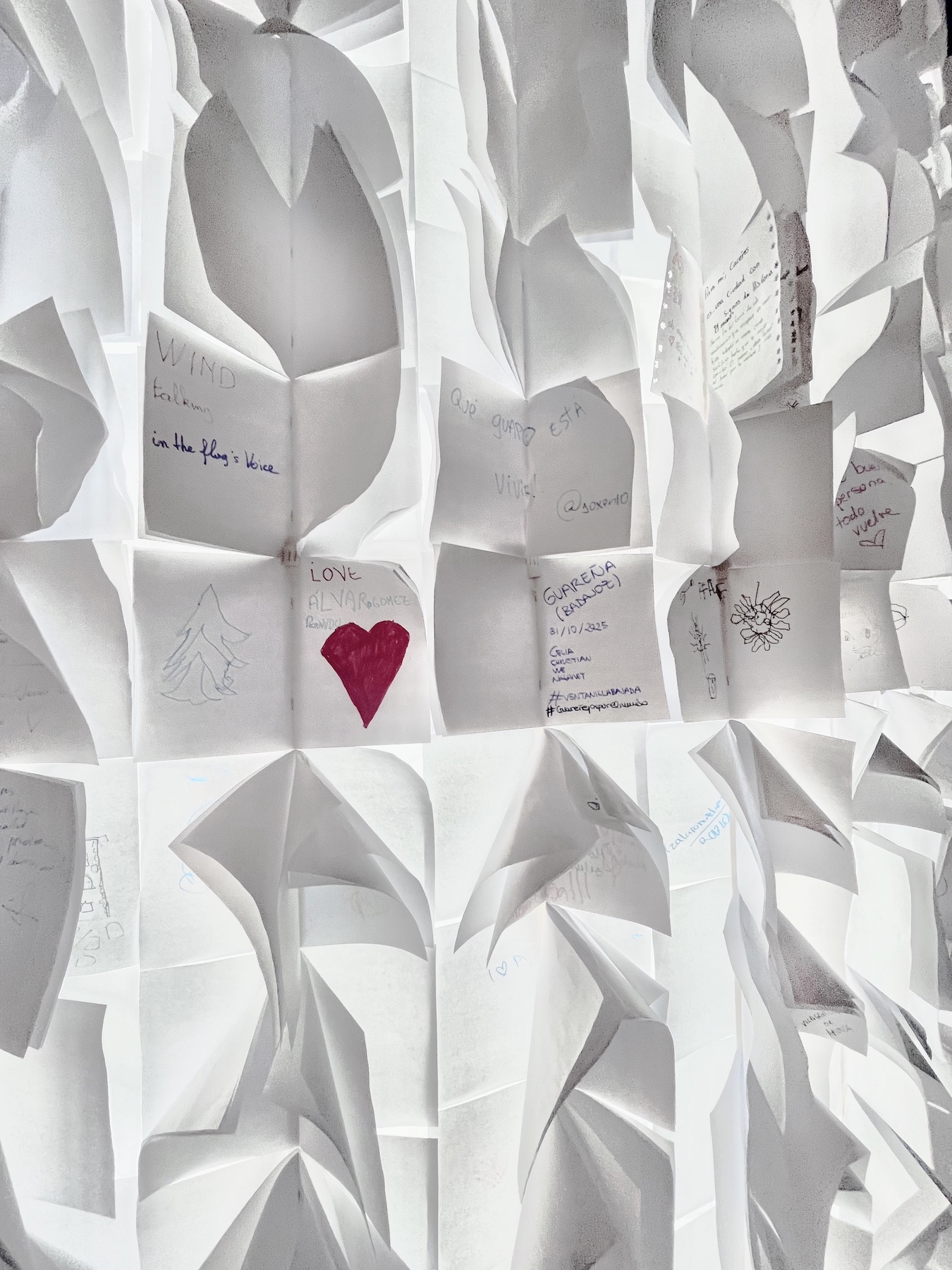Over the course of the event, the messages multiplied, and even the rain altered the physical appearance of the installation, adding an unexpected texture that reinforced its organic and mutable nature.