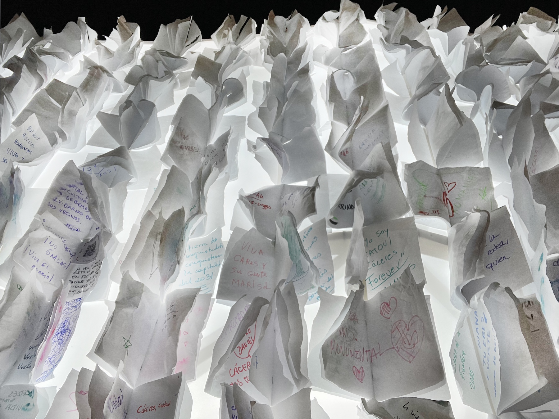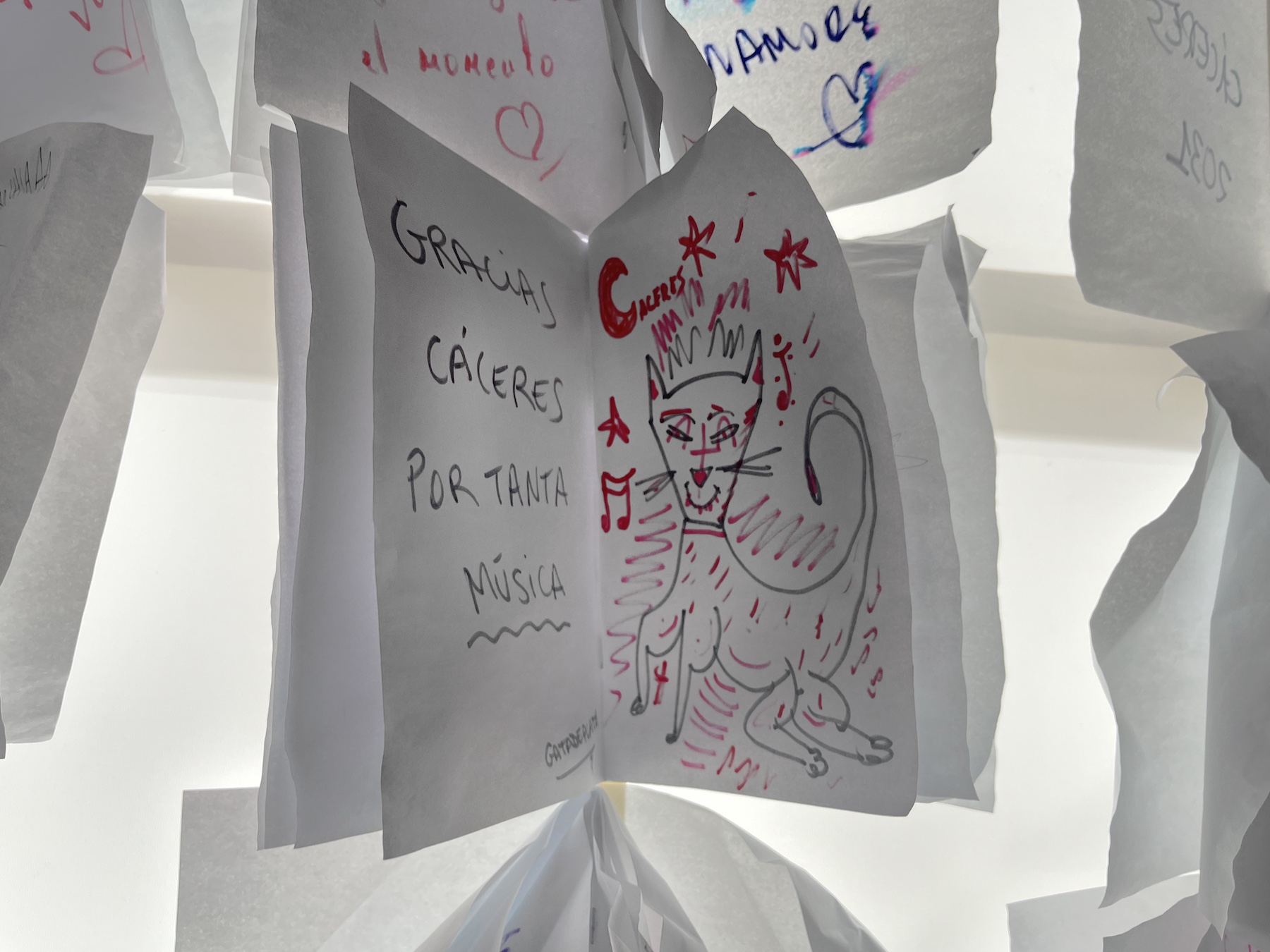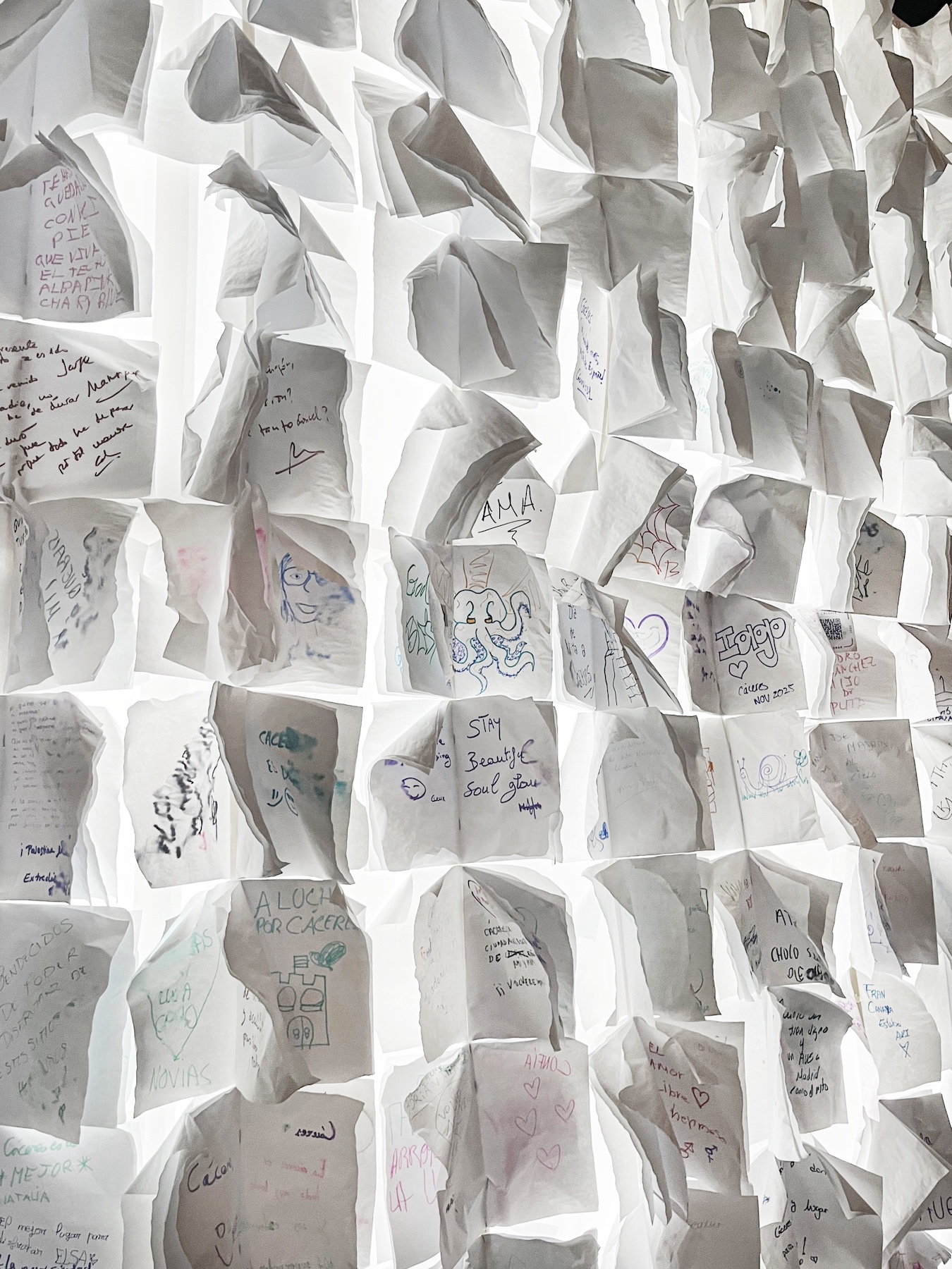 A lo largo de los días, los mensajes fueron creciendo y la lluvia incluso modificó el aspecto físico de la instalación, aportando una textura inesperada que reforzó su carácter orgánico y mutable.