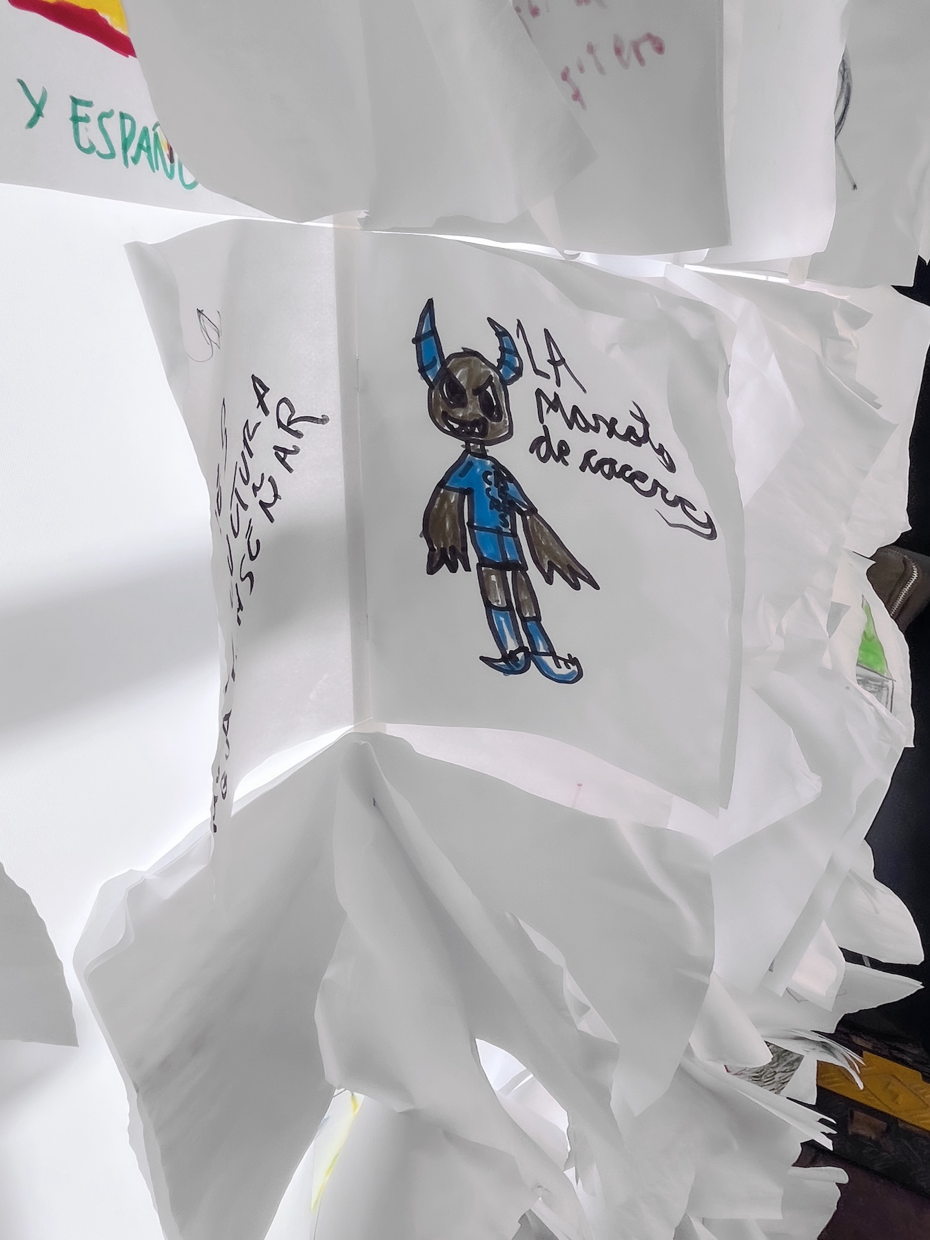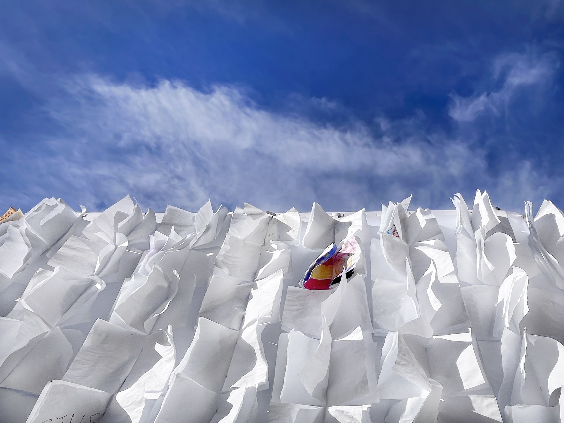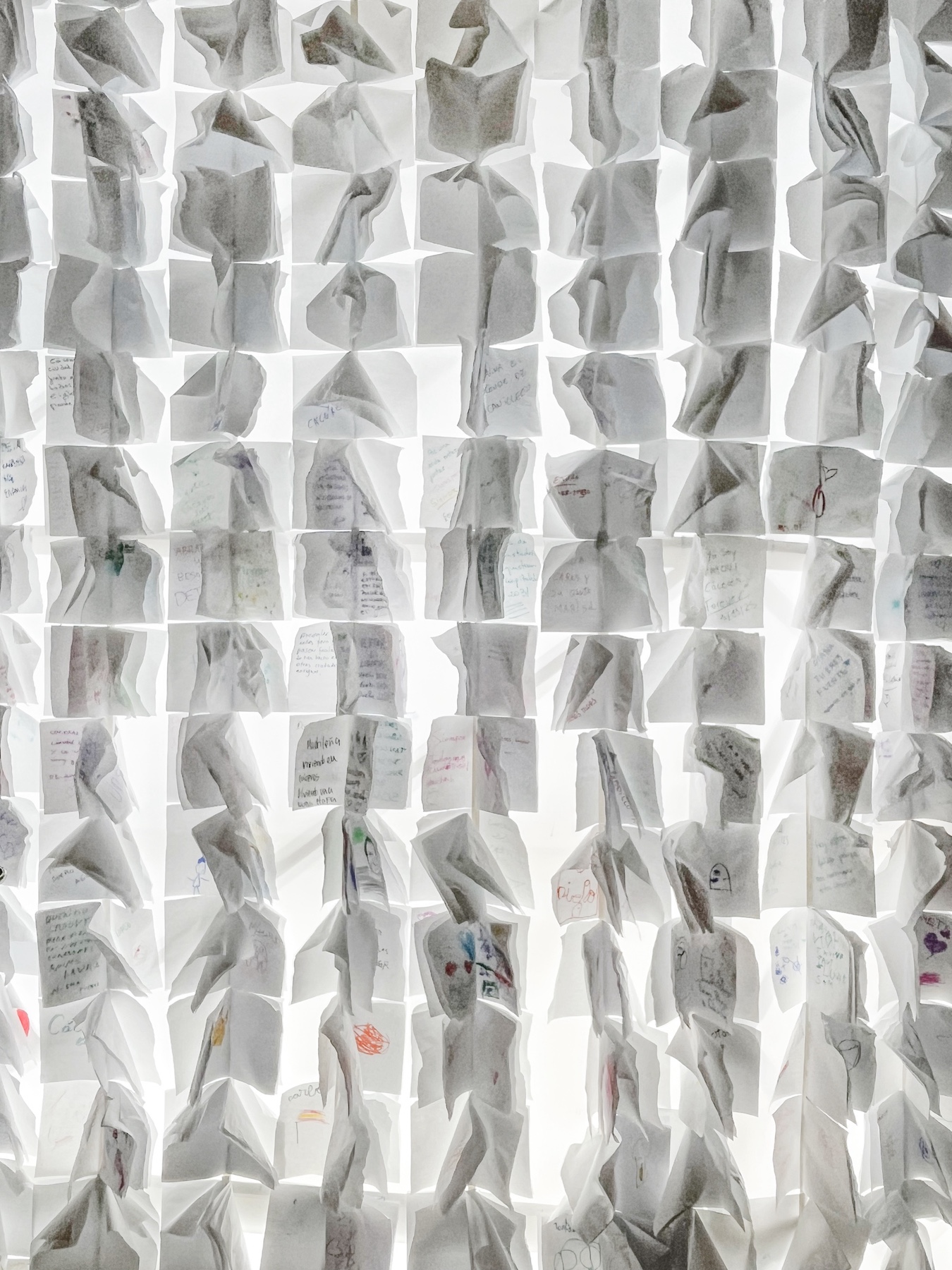 A lo largo de los días, los mensajes fueron creciendo y la lluvia incluso modificó el aspecto físico de la instalación, aportando una textura inesperada que reforzó su carácter orgánico y mutable.