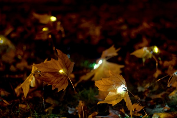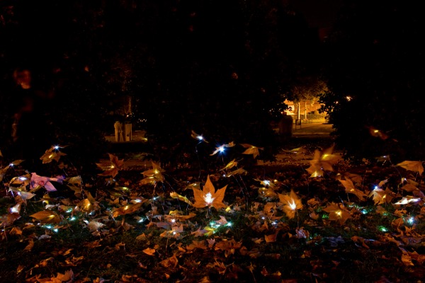 Para la instalación, Otoño casi efímero, iluminamos unas 200 hojas secas y las elevamos del suelo, hasta que nos pareció que de verdad una ligera ráfaga de luz había hecho elevarse las hojas caídas por el otoño.