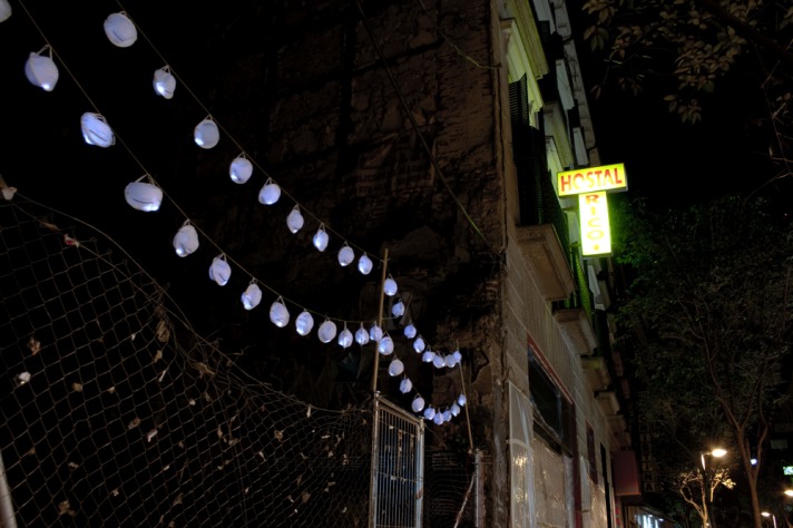 Con nuestra instalación Farolillos para espacios contaminados, queríamos sugerir que quizás estos solares, ahora cerrados y sucios, pudieran convertirse en espacios públicos, cedidos temporalmente para ser usados por los ciudadanos, hasta el momento en que los dueños, por fin puedan ver cumplidas sus expectativas.