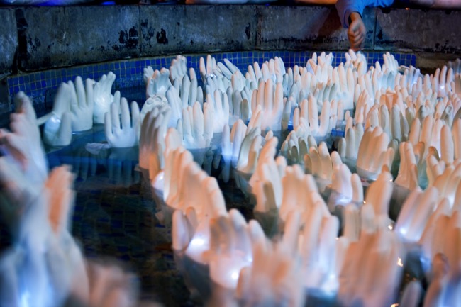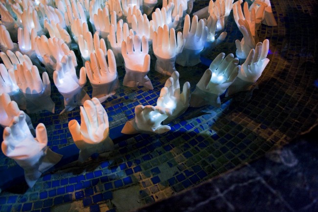 Así que decidimos llenarla de manos, con luz blanca, que emergían del agua, flotando con un suave balanceo, invitando a la gente a aproximarse y quedarse un buen rato mirando.