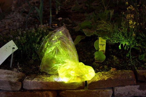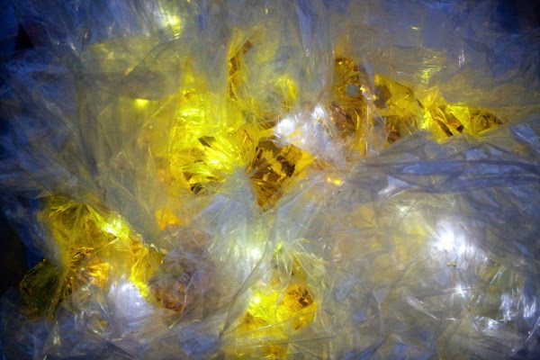 Así, ideamos unos rústicos farolillos, hechos con bolsas de plástico, agua dorada (colorante comestible) y confetti del mismo color.