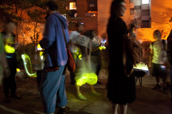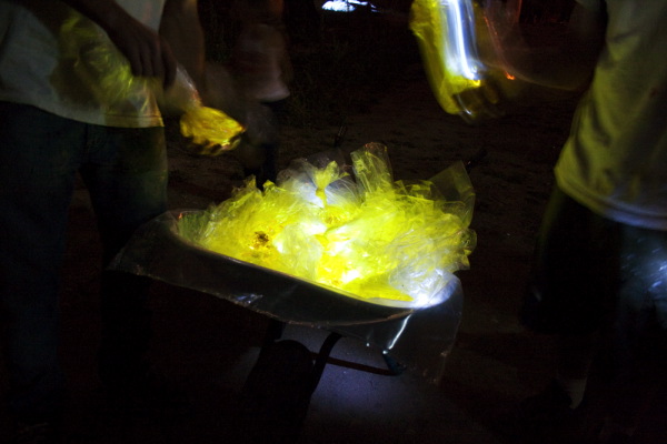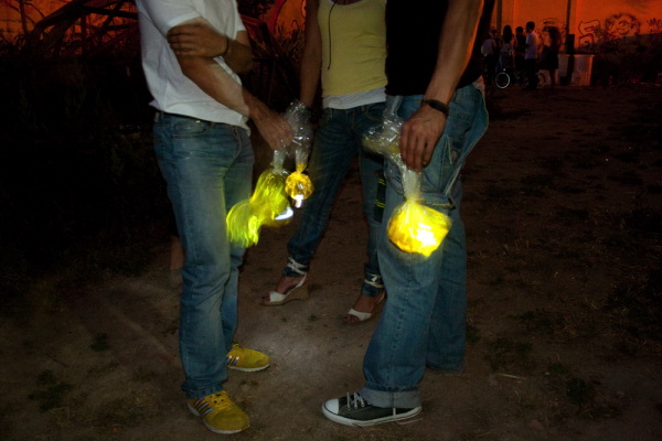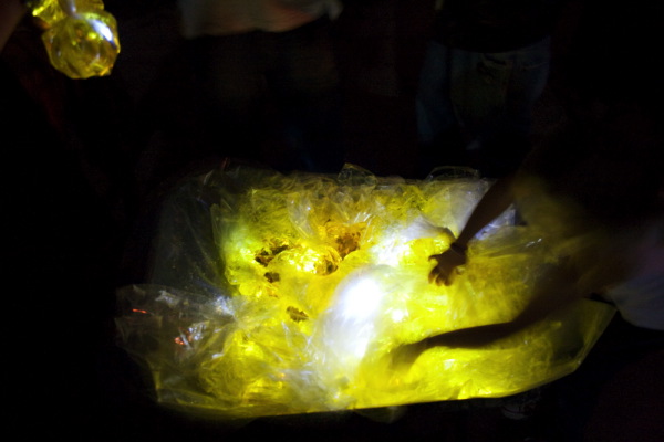 We made 100 units by hand, we lit them and shaped them like snow balls, and when they were waved, the golden pieces flew inside giving out happy glistenings that lit the space, all dark until then.