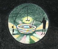 Al lado de cada uno de los recipientes habrá situadas cañas de pescar, colocadas en posición vertical y en el extremo de los hilos colgarán peces como si hubieran sido pescados del interior de los objetos de luz.