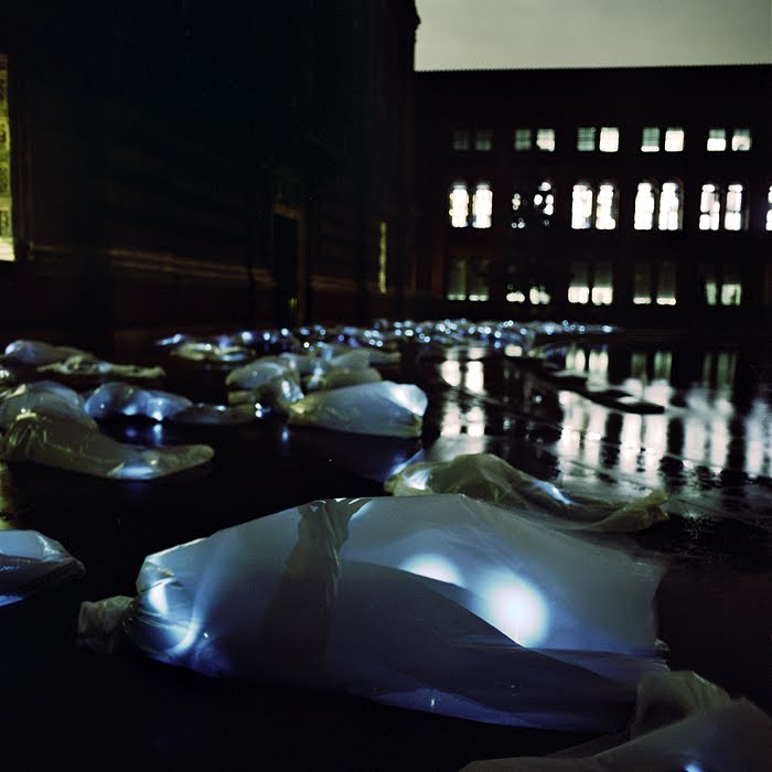 Las figuras, fueron vestidas de negro y encerradas en gigantes bolsas de basura blanca, a las que añadimos puntos de luz, estratégicamente colocados, para conseguir el efecto de auténticas sombras atrapadas.