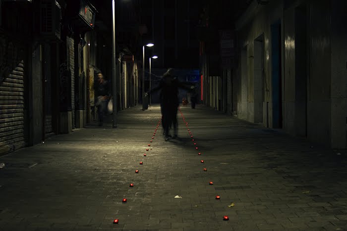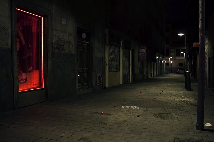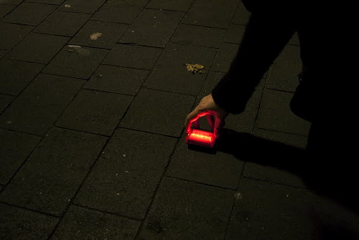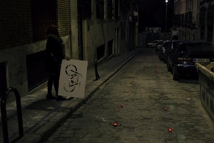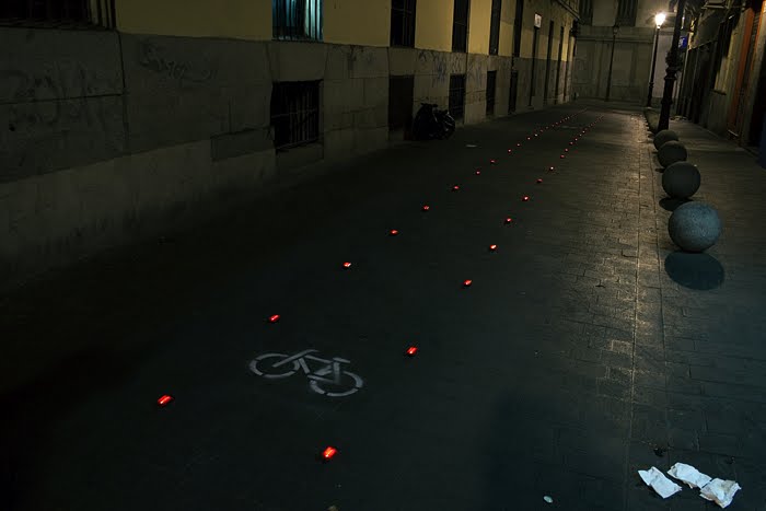 Para llevarla a cabo, elegimos 3 calles céntricas, esperamos a que se vaciaran de coches e instalamos cientos de luces rojas intermitentes de bicicleta formando un carril central, que marcamos con el icono del carril bici.