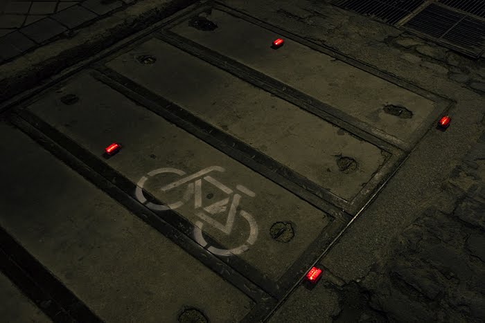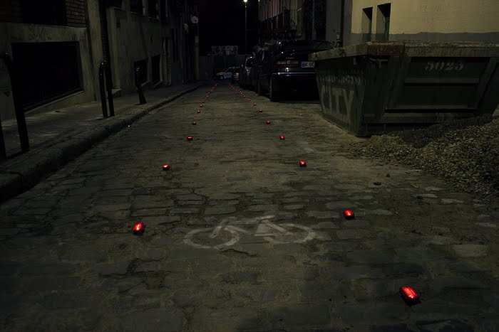 To carry this out, we chose 3 central streets, we waited until they were empty of cars and we installed hundreds of flashing red bicycle lights forming a central lane which we marked with the bike lane icon.
