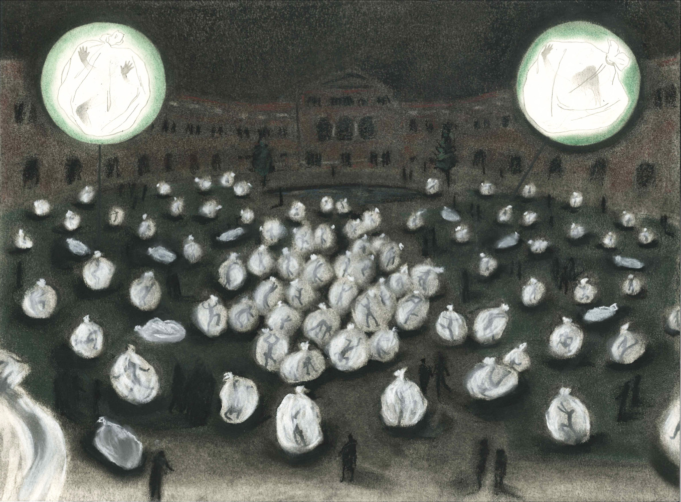 Las figuras, fueron vestidas de negro y encerradas en gigantes bolsas de basura blanca, a las que añadimos puntos de luz, estratégicamente colocados, para conseguir el efecto de auténticas sombras atrapadas.