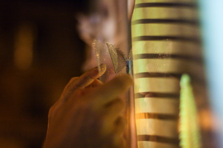 For our installation Urban Nests, we only had to populate the balls with 130 colored birds, that we left looking into the street from their makeshift homes in the scaffolding and of course light them, to achieve a warm, cozy atmosphere throughout the scaffolded area, inviting one to remain and contemplate such an unusual habitat.